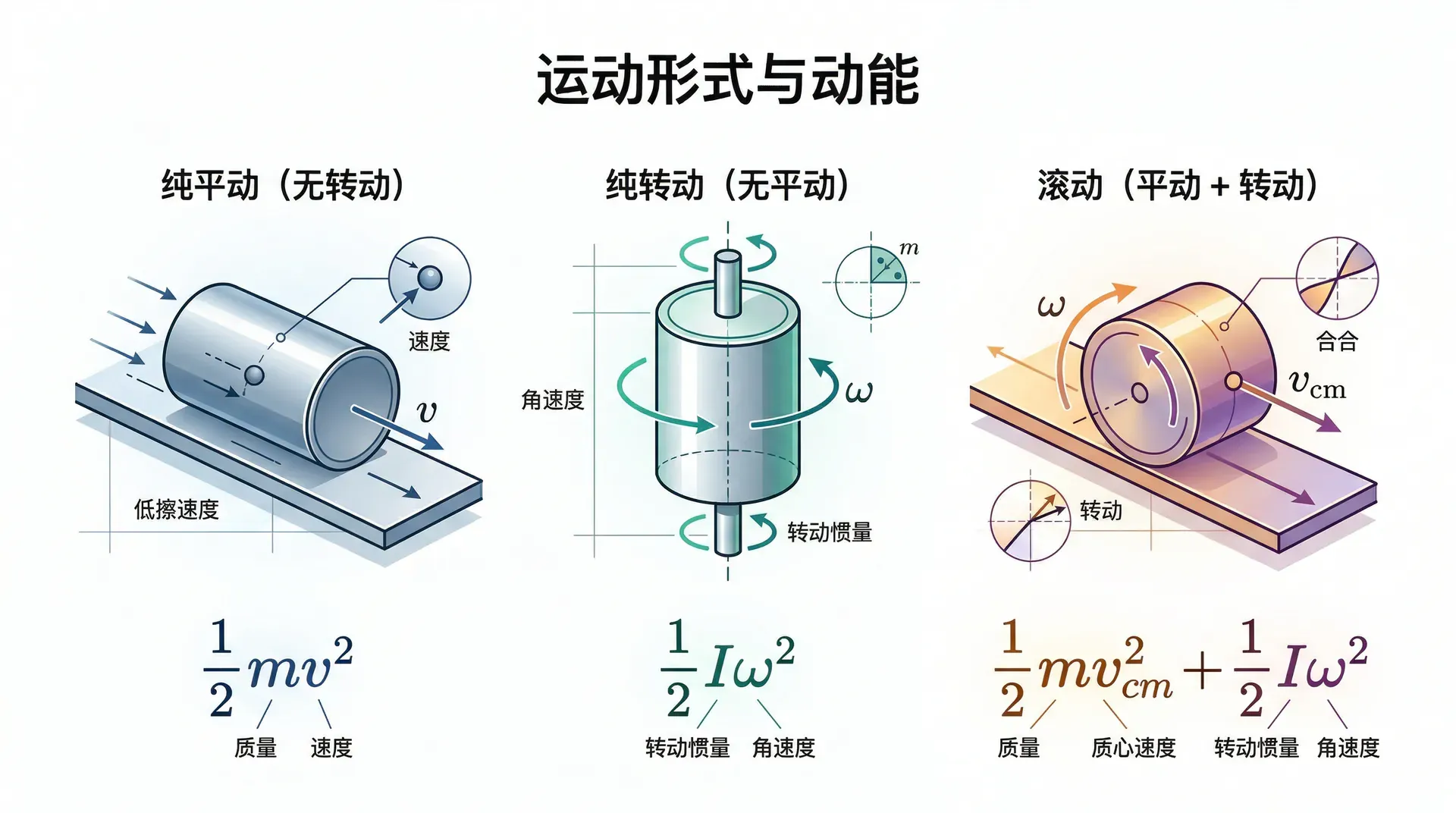 一个物体既有平动(质心运动)又有自转(如滚动的球)时,总动能等于两部分之和: