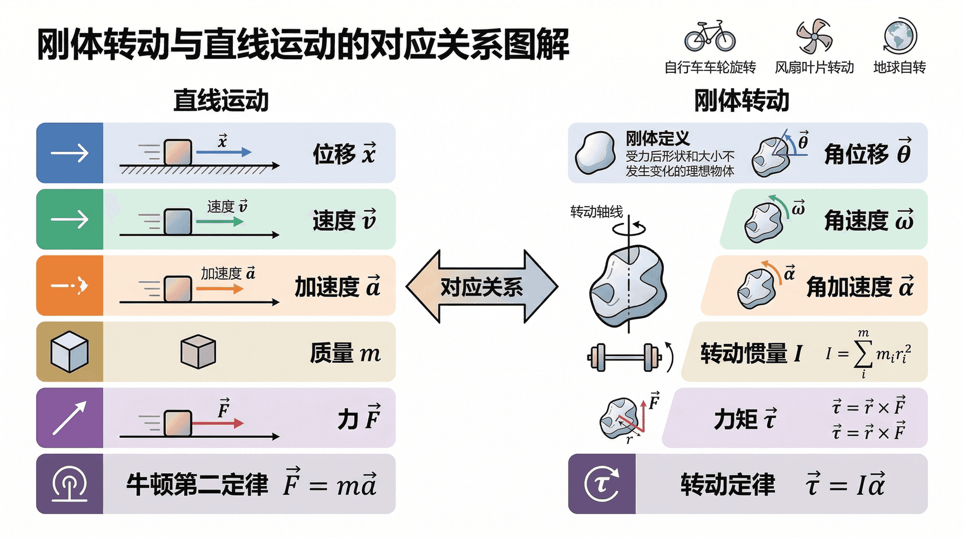 刚体的转动与直线运动有深刻的对应关系。直线运动中有位移、速度、加速度、质量、力、牛顿第二定律;刚体转动中有对应的角位移、角速度、角加速度、转动惯量、力矩和转动定律。掌握这套对应关系,转动问题的分析就会变得清晰而有条理。