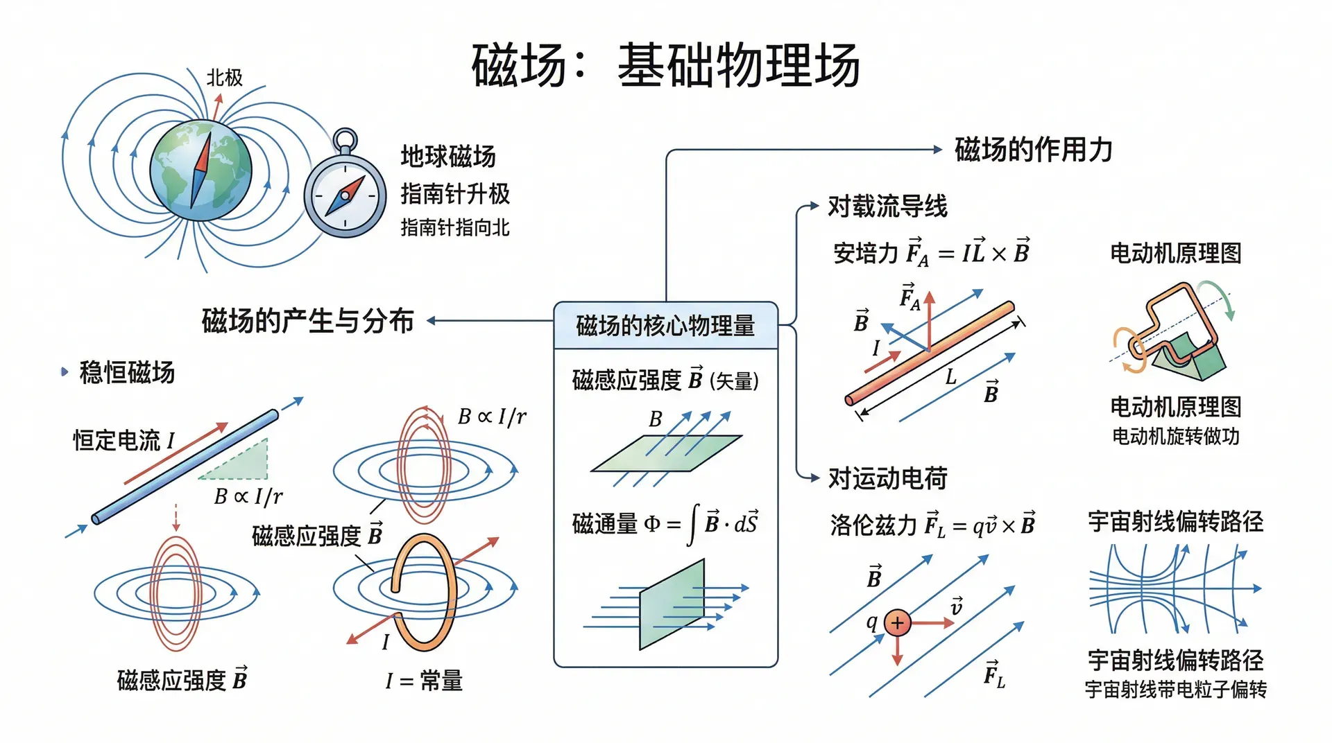 磁场是自然界中最基本的物理场之一。指南针能够指向北方,电动机能够旋转做功,带电粒子在宇宙射线中发生偏转,这些现象背后都有磁场的作用。稳恒磁场由恒定电流产生,场的分布不随时间改变。从这一章开始,我们将系统地研究磁场的来源、分布规律以及它对电流和运动电荷的力的作用。