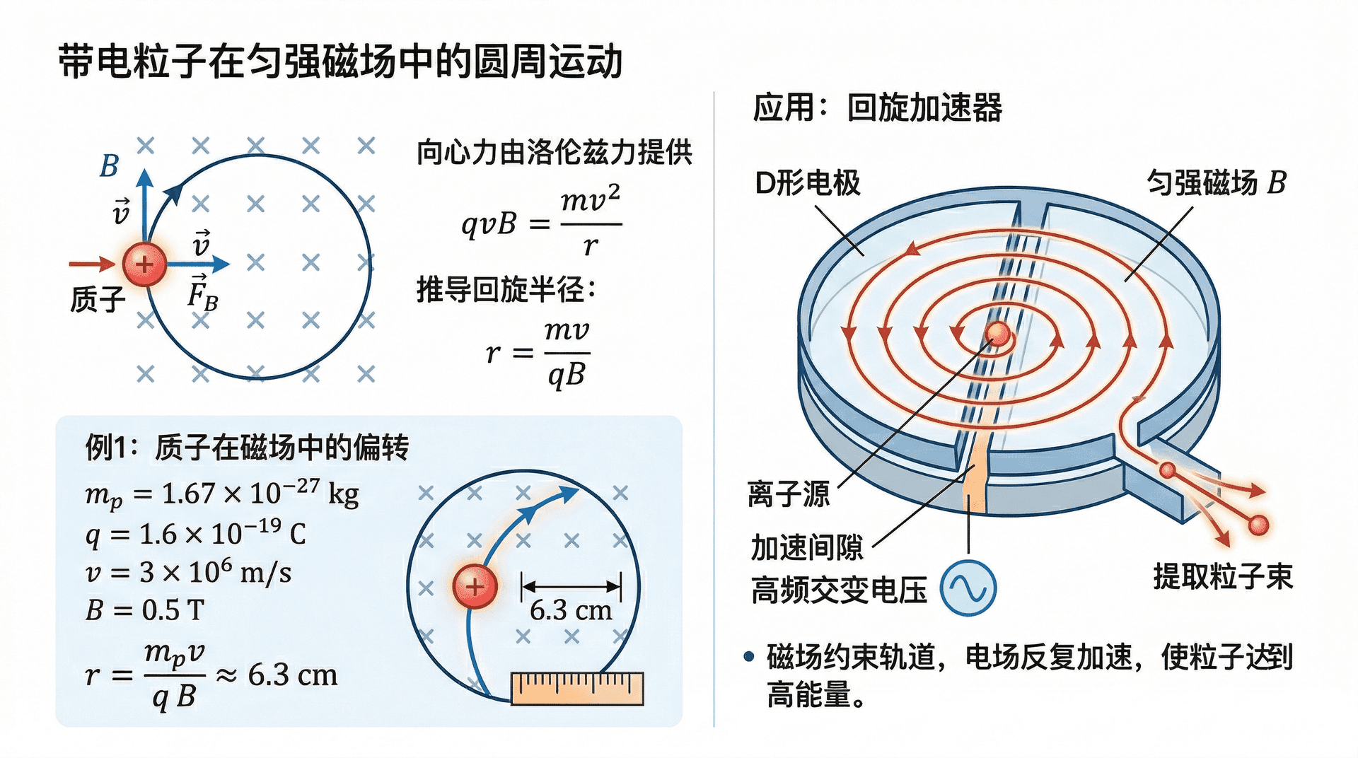 质子的回旋半径约为 6.3 cm。回旋加速器正是利用这一原理,通过磁场约束粒子轨道,交变电场反复加速,使粒子最终达到很高的能量。