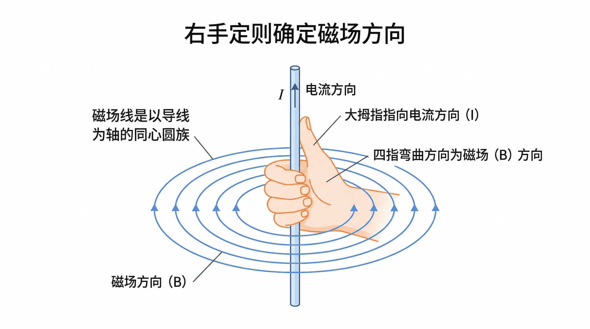 磁场方向由右手定则确定:右手大拇指指向电流方向,四指自然弯曲的方向即为磁场的环绕方向,磁场线是以导线为轴的同心圆族。