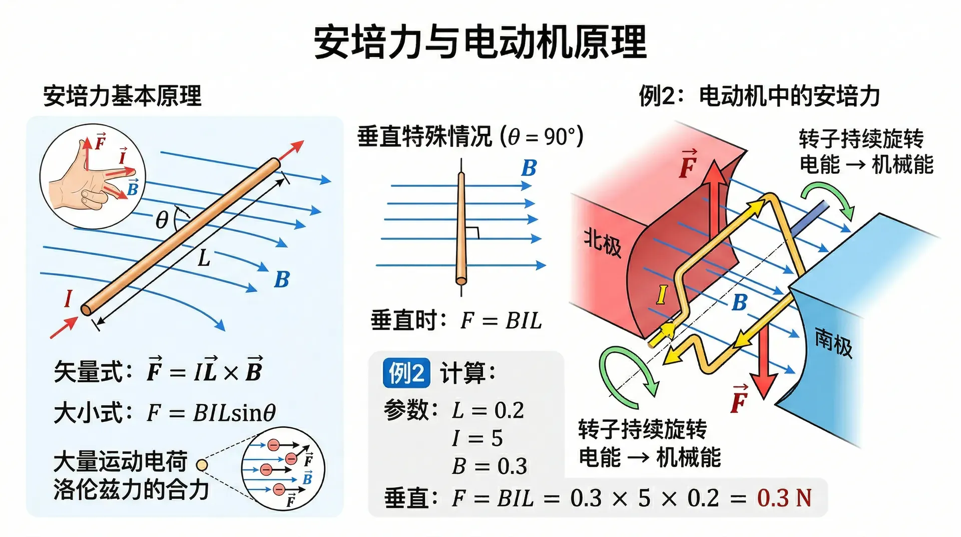 载流导线在磁场中受到的力称为安培力,它是导线中大量运动电荷所受洛伦兹力的合力。对于长度为 L、通有电流 I 的直导线: