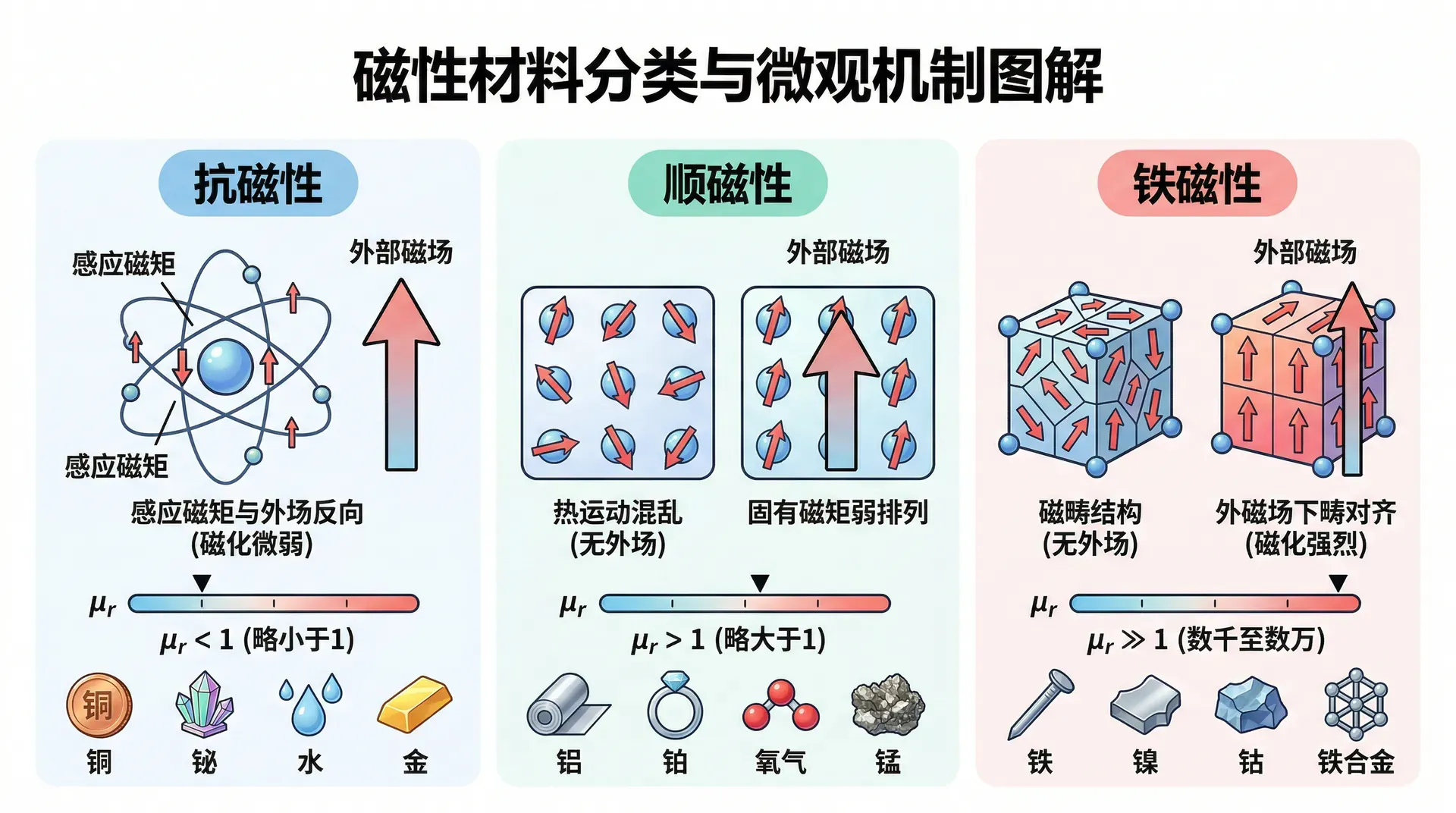 根据物质在外磁场中的磁化行为,可以将材料分为三大类: