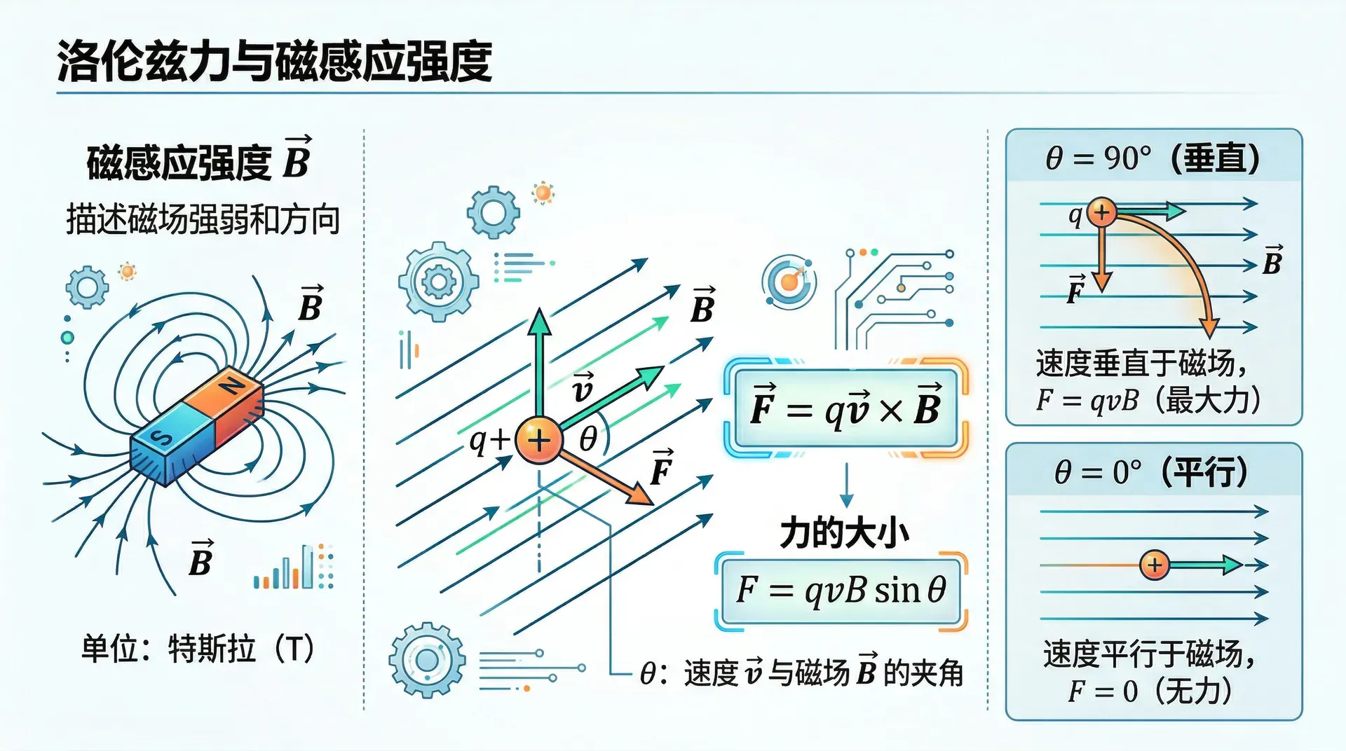 描述磁场强弱和方向的物理量是磁感应强度 B,单位是特斯拉(T)。磁场的存在通过它对运动电荷的作用力来体现——这个力就是洛伦兹力。