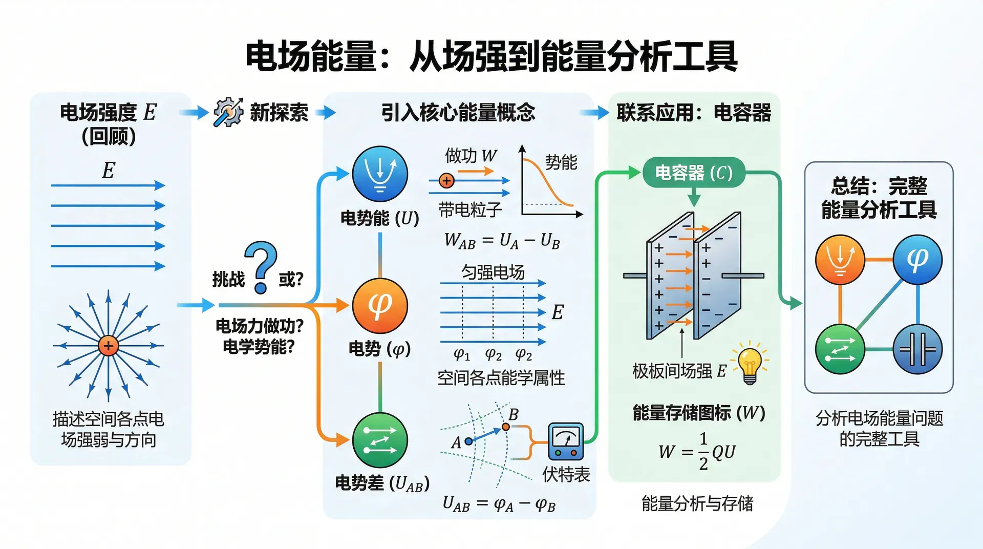 从电场强度出发,我们已经能够描述空间各点电场的强弱与方向。然而仅有电场强度还不够——带电粒子在电场中运动时,电场力究竟做了多少功?粒子的“电学势能”是多少?这些问题需要引入新的物理量来回答。本章建立电势能、电势、电势差的概念,再将其与电容器联系起来,形成一套分析电场中能量问题的完整工具。