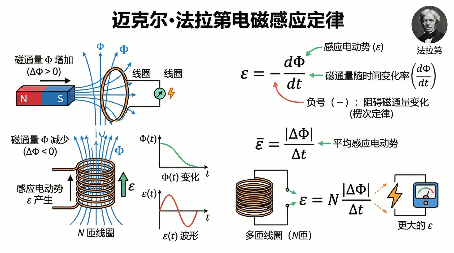 负号的含义来自楞次定律(下一节详述),表明感应电动势总是阻碍磁通量的变化。在处理匀变化的情形时,常用平均感应电动势: