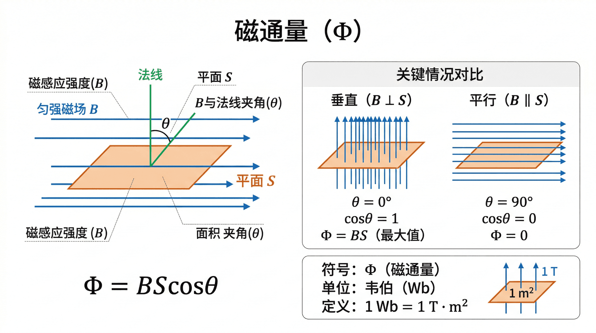 要理解电磁感应,首先要掌握“磁通量”这个物理量。磁通量描述的是穿过某一平面的磁场的“总量”。对于匀强磁场,磁感应强度为 ,所研究的平面面积为 ,磁场方向与该平面法线方向的夹角为 ,则磁通量定义为: