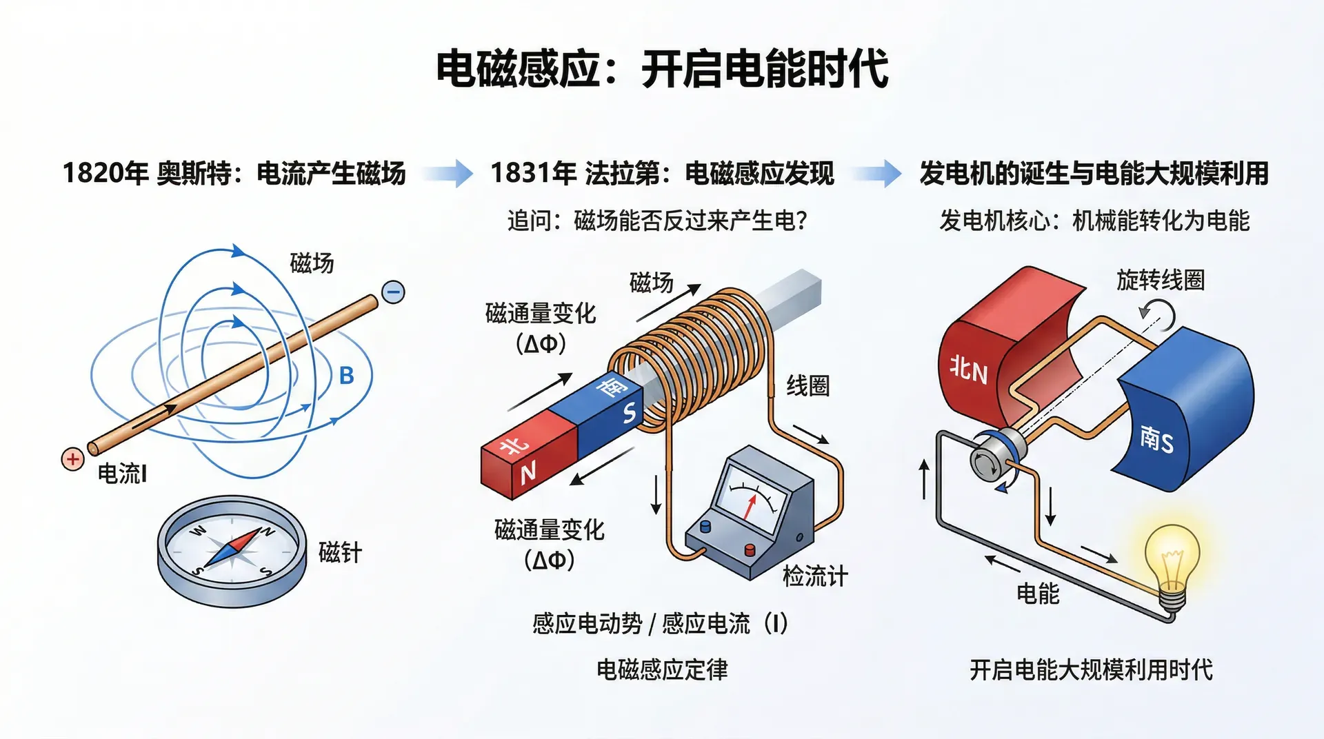 电和磁之间存在着深刻的内在联系。奥斯特发现电流能够产生磁场之后,科学家们开始追问另一个方向:磁场能否反过来产生电?1831年,法拉第通过反复实验给出了肯定的答案,并归纳出了电磁感应的核心规律。这一发现直接催生了发电机的诞生,开启了人类大规模利用电能的时代。