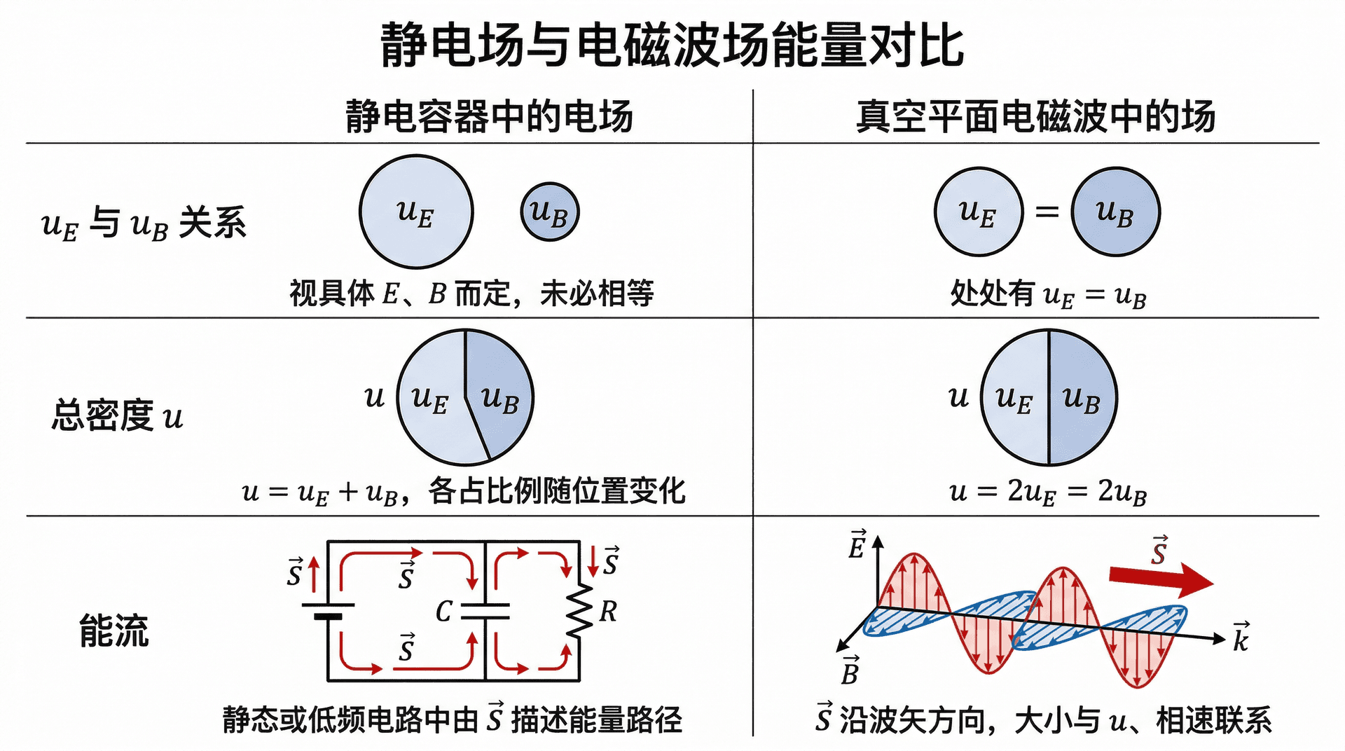 因此总电磁能量密度 u=uE+uB 中,电、磁两部分各占一半。这与坡印廷矢量描述的能量传播图像一致:波向前推进时,电场能与磁场能同步交换、共同向前传递,而不是其中一种单独承担全部能量。