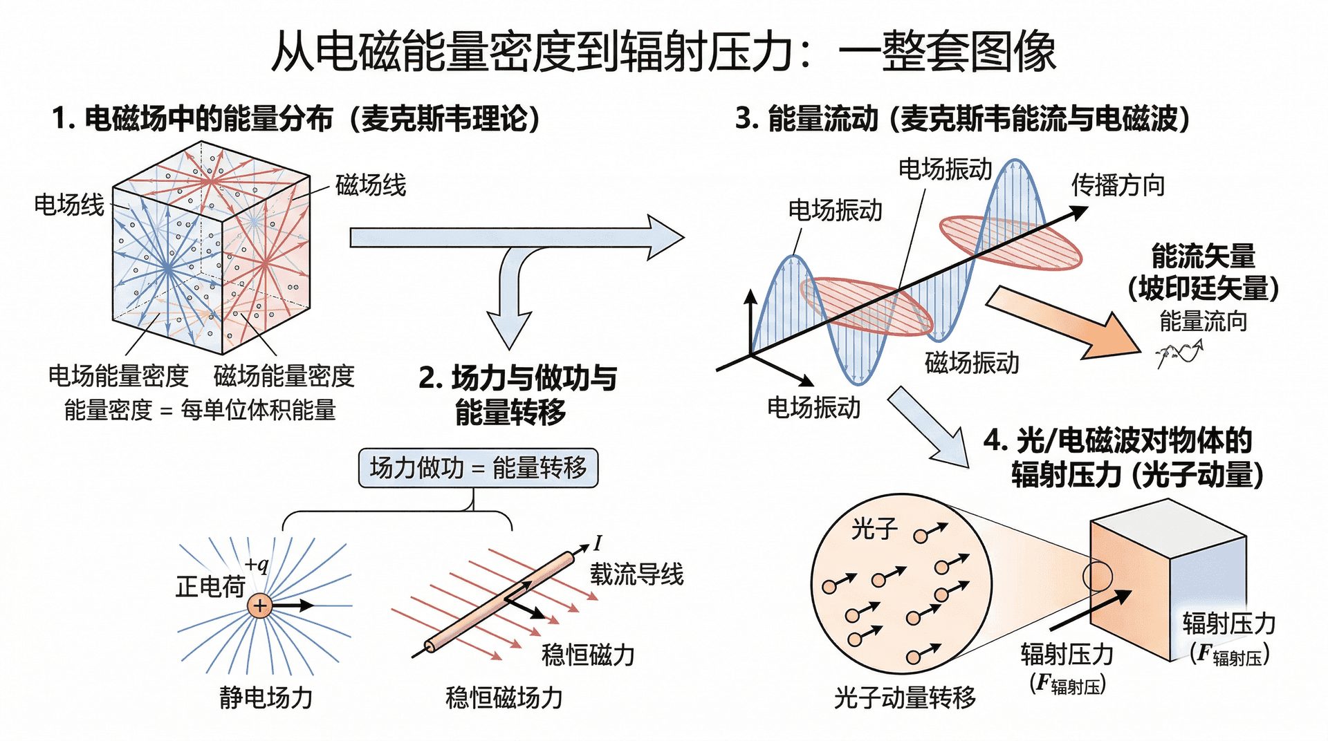 静电场对电荷有力的作用,稳恒磁场对电流和运动电荷也有力的作用。做功与能量转移必然伴随其中。把能量看成只贮存在电荷或电流上并不完整——麦克斯韦理论表明,能量可以分布在电场与磁场占据的空间里,并且能够以电磁波的形式在空间流动。坡印廷矢量描述这种能流;光与电磁波照到物体表面时,还会产生辐射压力,与光子的动量相联系。下面从能量密度出发,逐步建立这一整套图像。