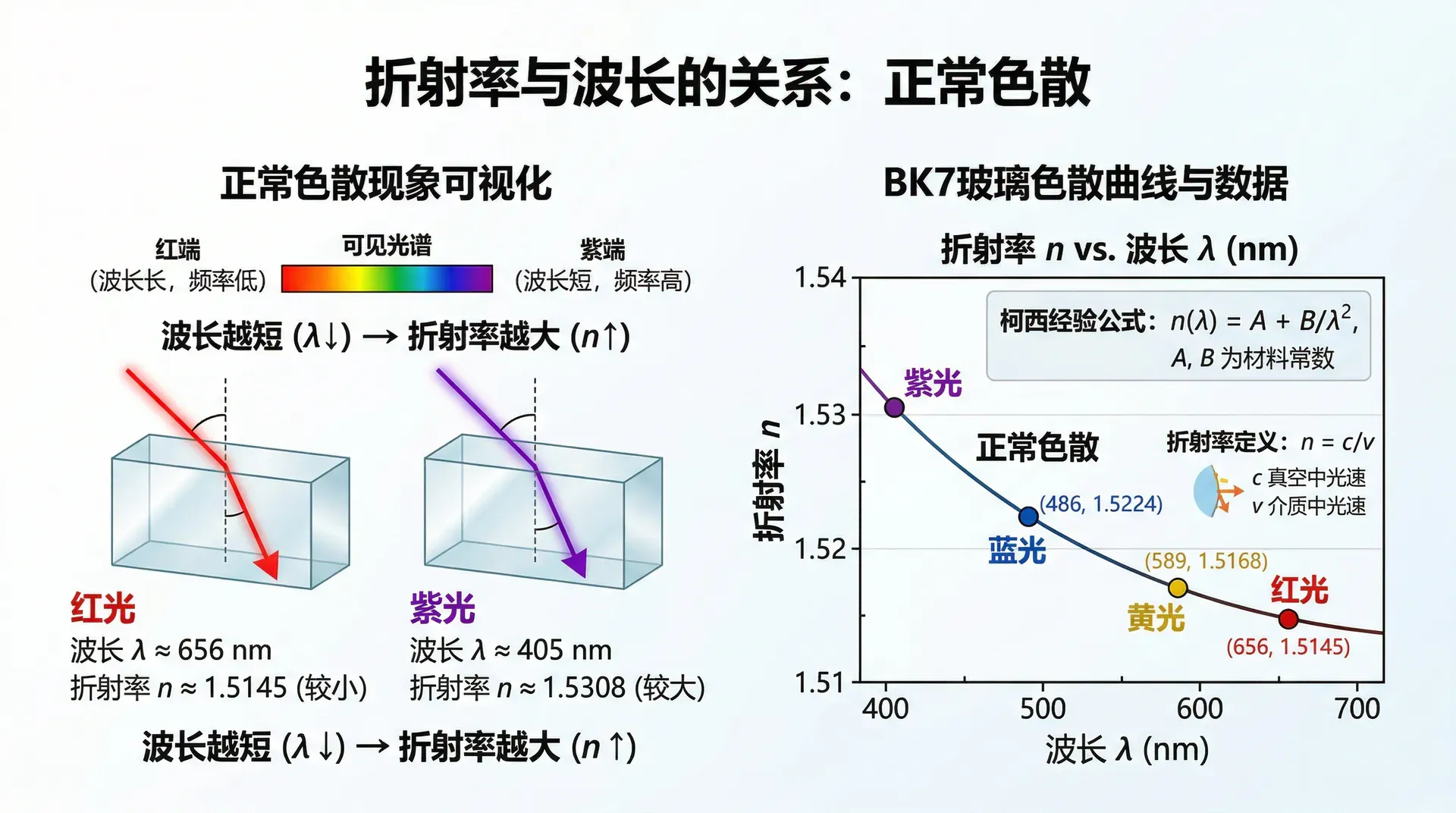 光在真空中的速度 对所有波长都相同。但光在玻璃等介质中传播时,不同波长的光速略有差异,导致折射率随波长变化: