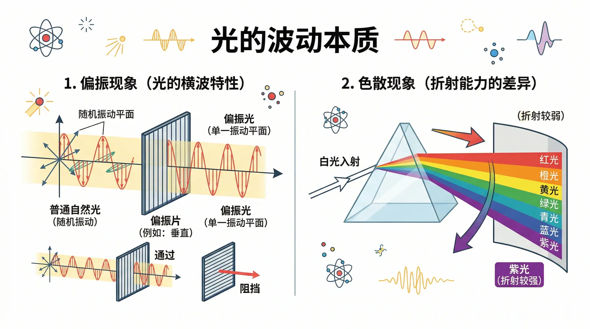 光是一种电磁波,它的振动方向与传播方向垂直——正是这一横波特性,决定了偏振现象的存在。偏振光与普通自然光在外观上看起来没什么差别,但通过一块偏振片,两者立刻显出截然不同的表现。色散现象则揭示了光与物质相互作用时,不同颜色的光折射能力有所不同的规律。这两个现象背后,都隐藏着光的波动本质。