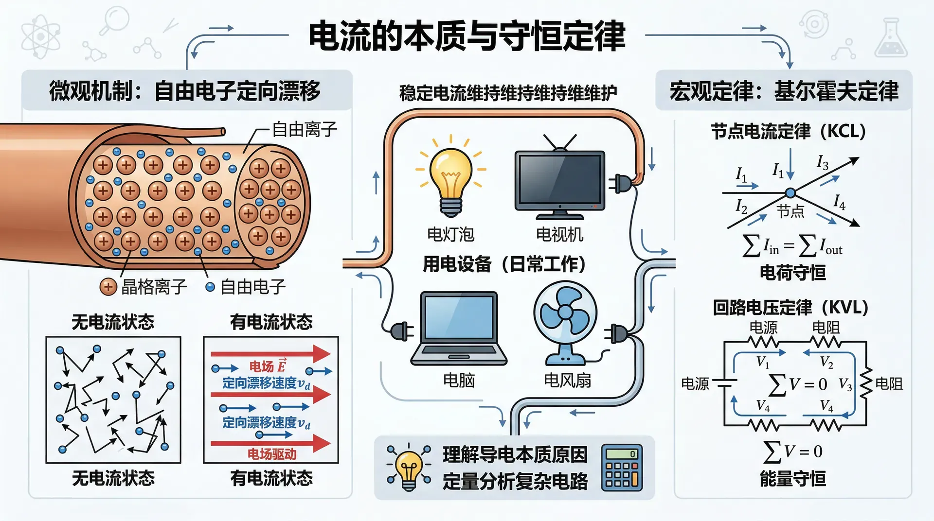 导线中的电荷运动形成了电流,日常生活中几乎一切用电设备都依赖稳定的电流维持工作。从微观上看,电流的本质是大量自由电子在电场驱动下的定向漂移;从宏观上看,电流在电路中的分配遵循两条严格的守恒定律——基尔霍夫定律。掌握这两方面的知识,既能理解导体导电的本质原因,又能对复杂电路进行定量分析。