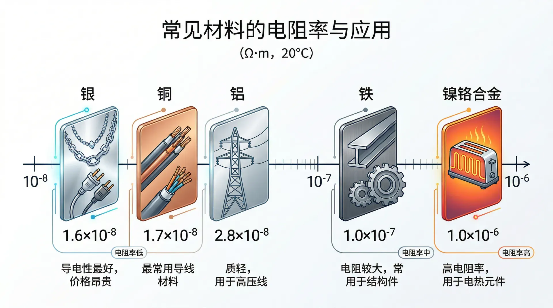 电阻率 ρ=m/(ne2τ) 是材料的固有属性,与导体的几何形状无关。相同材料制成的导体,无论粗细长短,电阻率相同;但电阻 R=ρL/S 则与长度和截面积密切相关,导线越长电阻越大,截面越粗电阻越小。