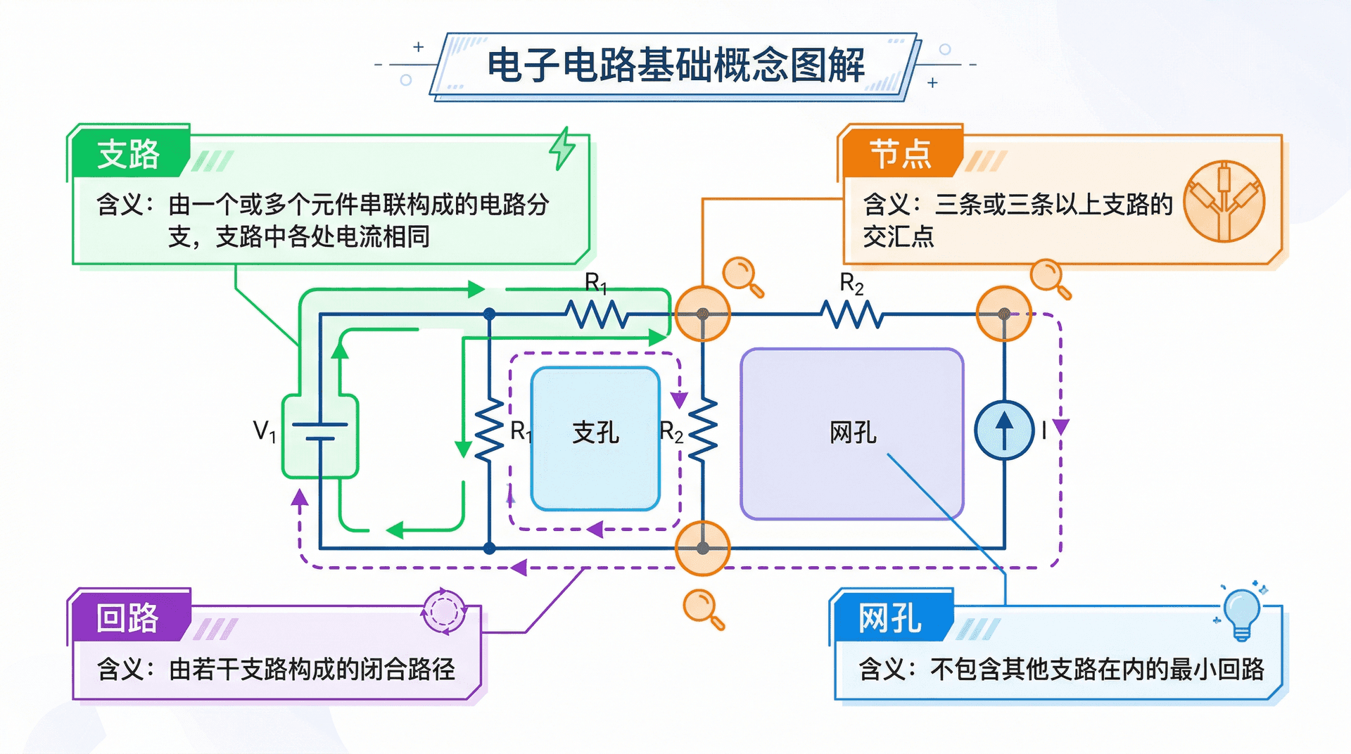实际电路往往不是简单的单回路,而是包含多个支路和节点的复杂网络。对这类复杂电路,单纯依靠欧姆定律难以求解。基尔霍夫提出的两条定律,提供了系统分析复杂电路的工具。