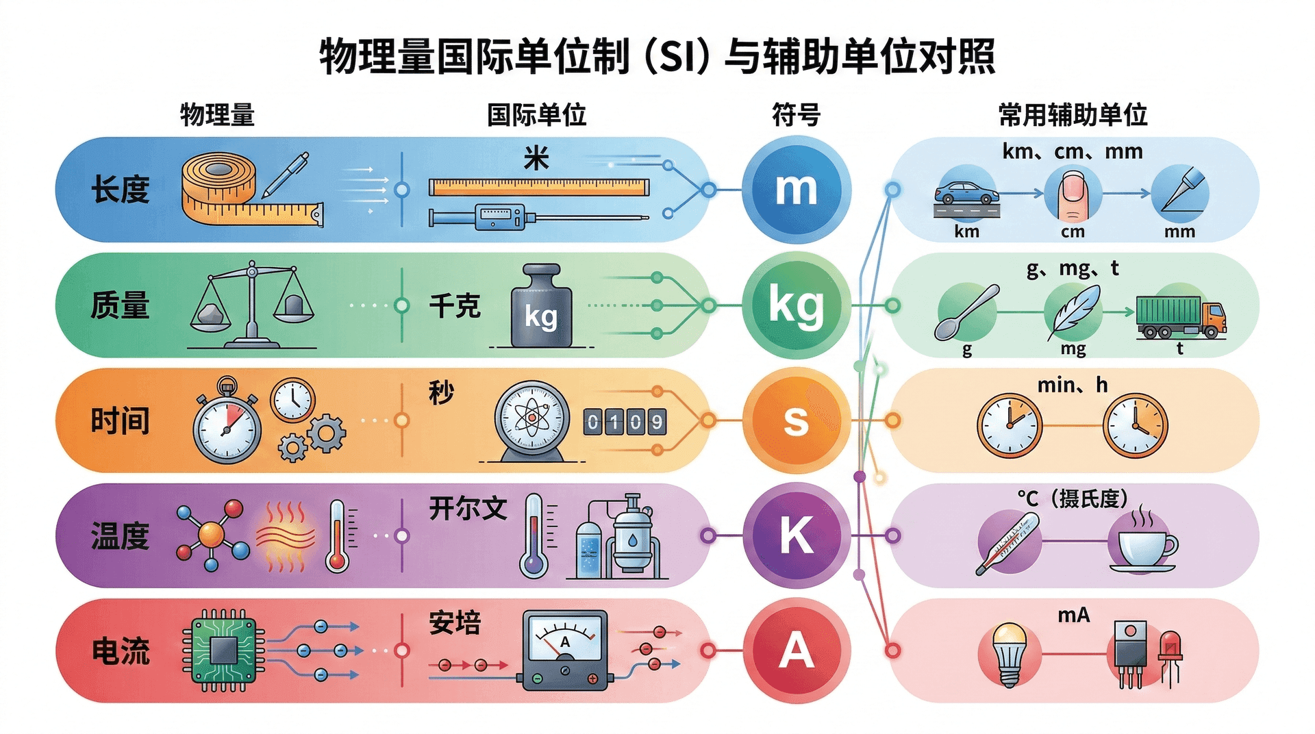 每一个物理量都有对应的单位。单位是测量的标准,没有单位的数字在物理学中没有意义。国际上通用一套单位体系,叫做国际单位制(简称SI),中国也采用这套体系。