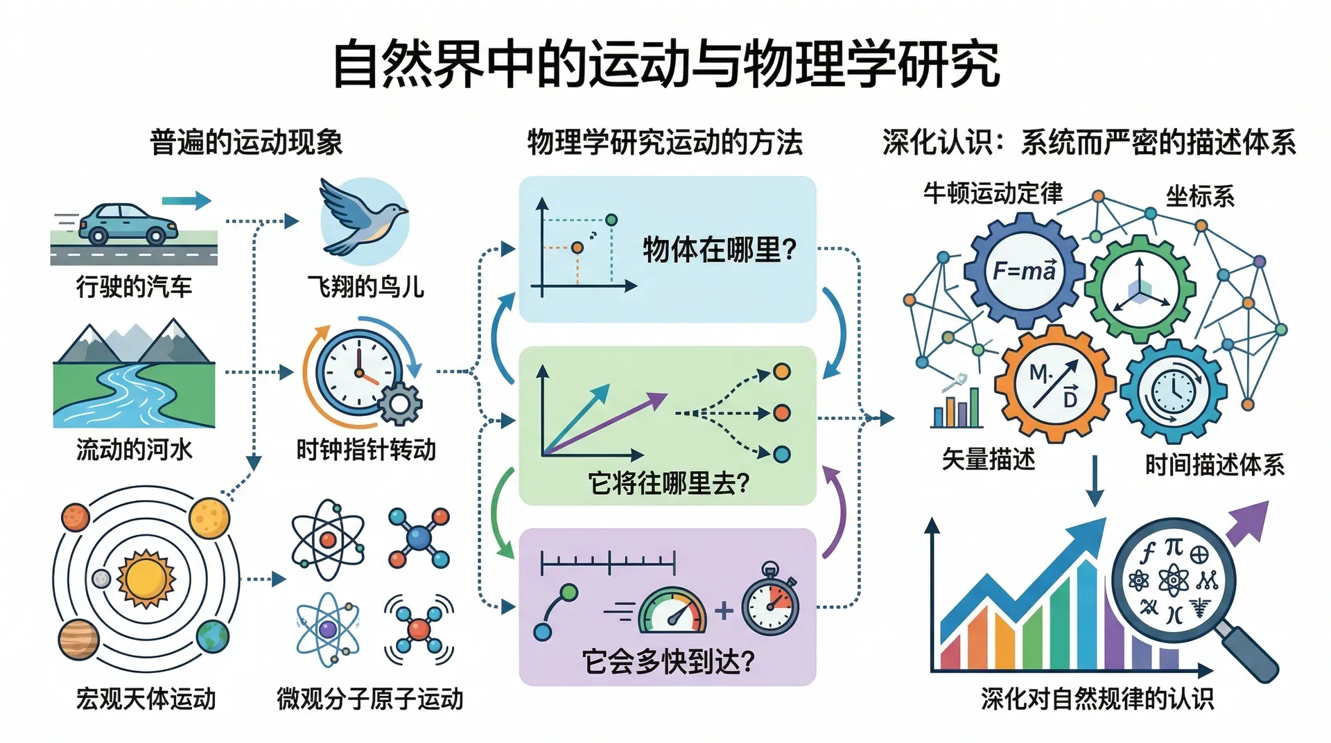 运动是自然界中最普遍、最基本的现象。无论是行驶在公路上的汽车、飞翔在空中的鸟儿、河流中潺潺流动的水,还是静静挂在墙上的时钟里缓缓转动的指针,它们都以不同的方式在运动。事实上,不论自然界的宏观天体,还是微观的分子、原子,无不存在着运动。物理学正是通过对运动现象的研究,从最基本的问题出发——比如“物体在哪里”、“它将往哪里去”、“它会多快到达”——逐步建立起一套系统而严密的运动描述体系,不断深化我们对自然规律的认识。