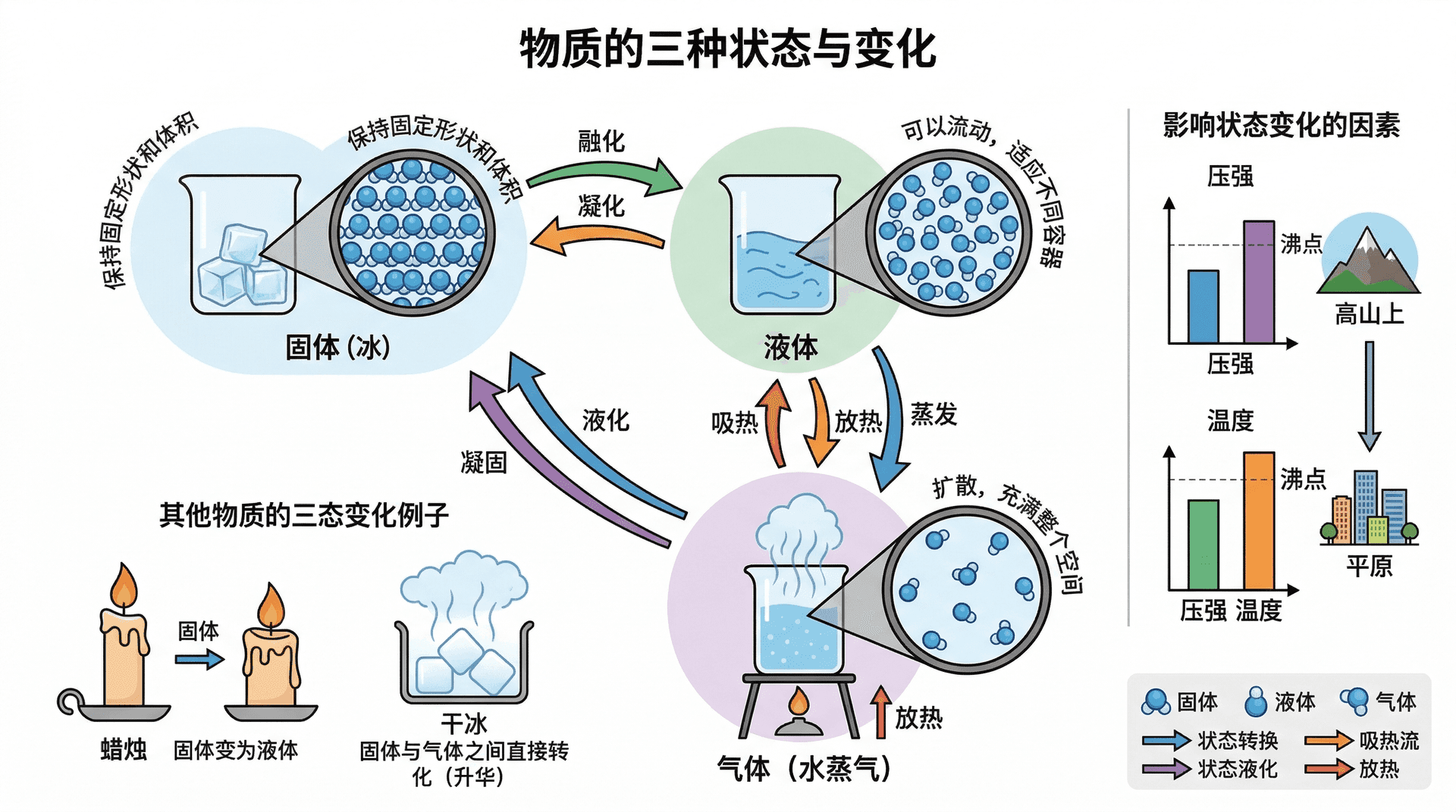 除了水之外,蜡烛的蜡也会在加热时从固体变成液体,而像二氧化碳这样的物质,则可以在干冰(固体)和气体之间直接转化。这些现象在日常生活和自然界中极为常见,充分展现了物质三态变化的丰富和有趣。