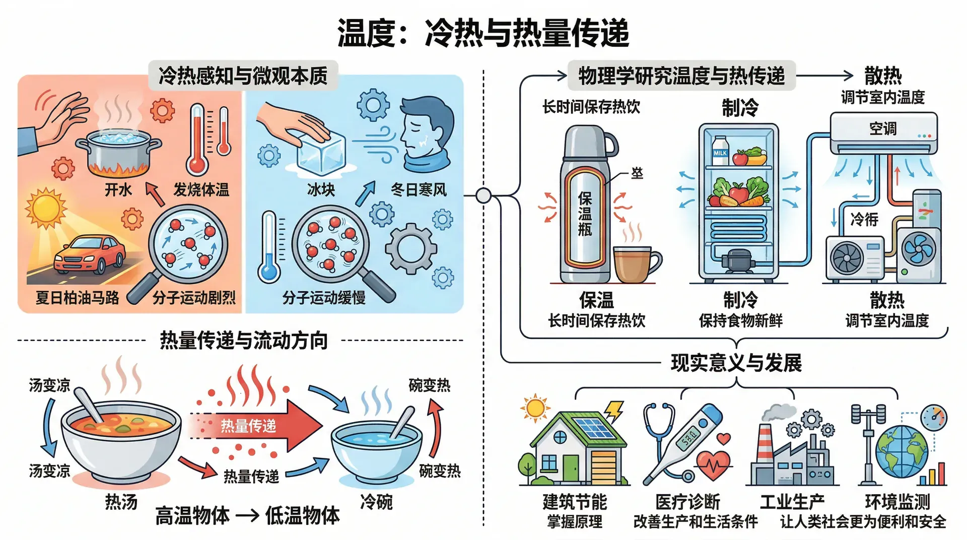 物理学家在研究温度时,不仅探究如何用科学的方法精确地测量这一物理量,还关注热量在不同物体之间是以什么方式流动的,以及人们如何运用这些原理进行保温、制冷或者散热。比如,保温瓶能长时间保存热饮,冰箱能够保持食物新鲜,空调可以调节室内温度,这些日常设备都应用了温度与热量传递的知识原理。温度的研究在建筑节能、医疗诊断、工业生产、环境监测等领域也有着极为重要的现实意义。借助对温度和热传递的掌握,我们不断改善着生产和生活条件,让人类社会更为便利和安全。