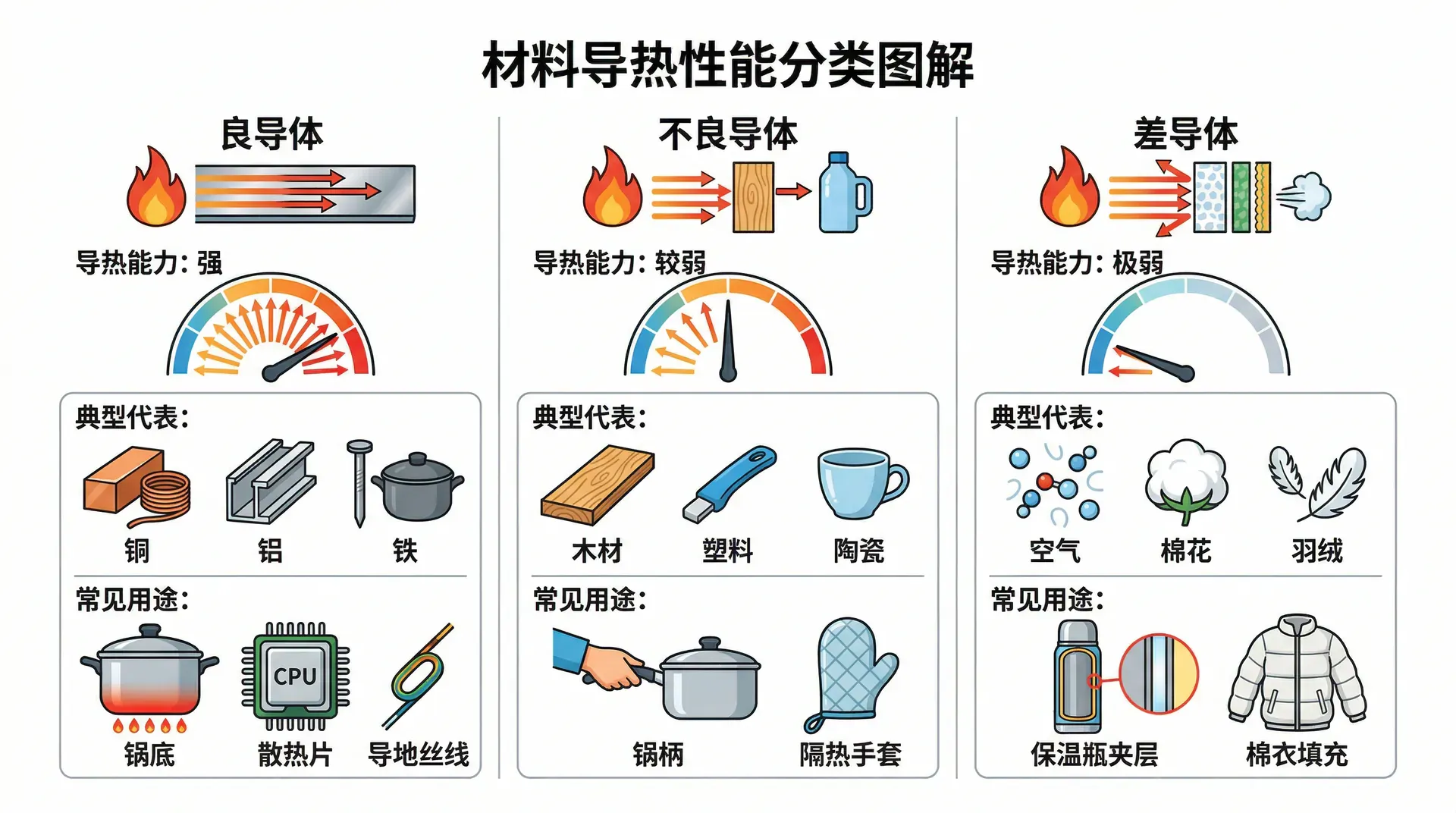 不同材料传导热量的能力差别很大。通常把导热能力强的材料叫做热的良导体,导热能力弱的材料叫做热的不良导体:
