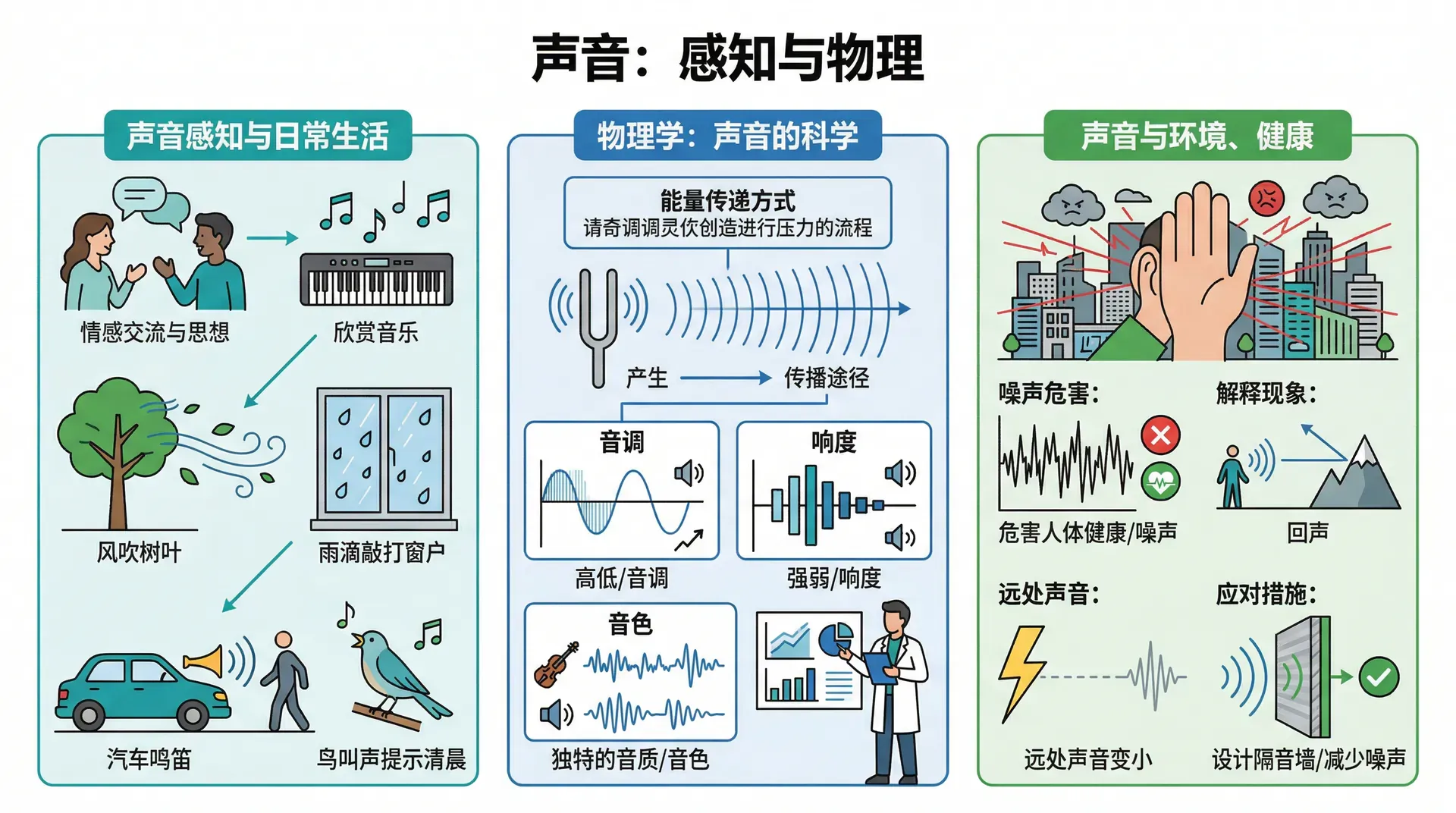 在物理学中,声音是一种能量的传递方式。物理学家研究声音,关注其产生的原因、传播的途径、以及为何会表现出不同的高低(音调)、强弱(响度)、和独特的音质(音色)。此外,日常生活中有些声音过于强烈、嘈杂,可能会对人体健康造成危害,这也是物理学探讨的重要内容之一。科学地理解声音的性质及其传播规律,能帮助我们更好地解释和应对生活中的声音现象,比如为什么会有回声、为何远处的雷声比近处小,或是怎样通过设计隔音墙来减少噪声的干扰。