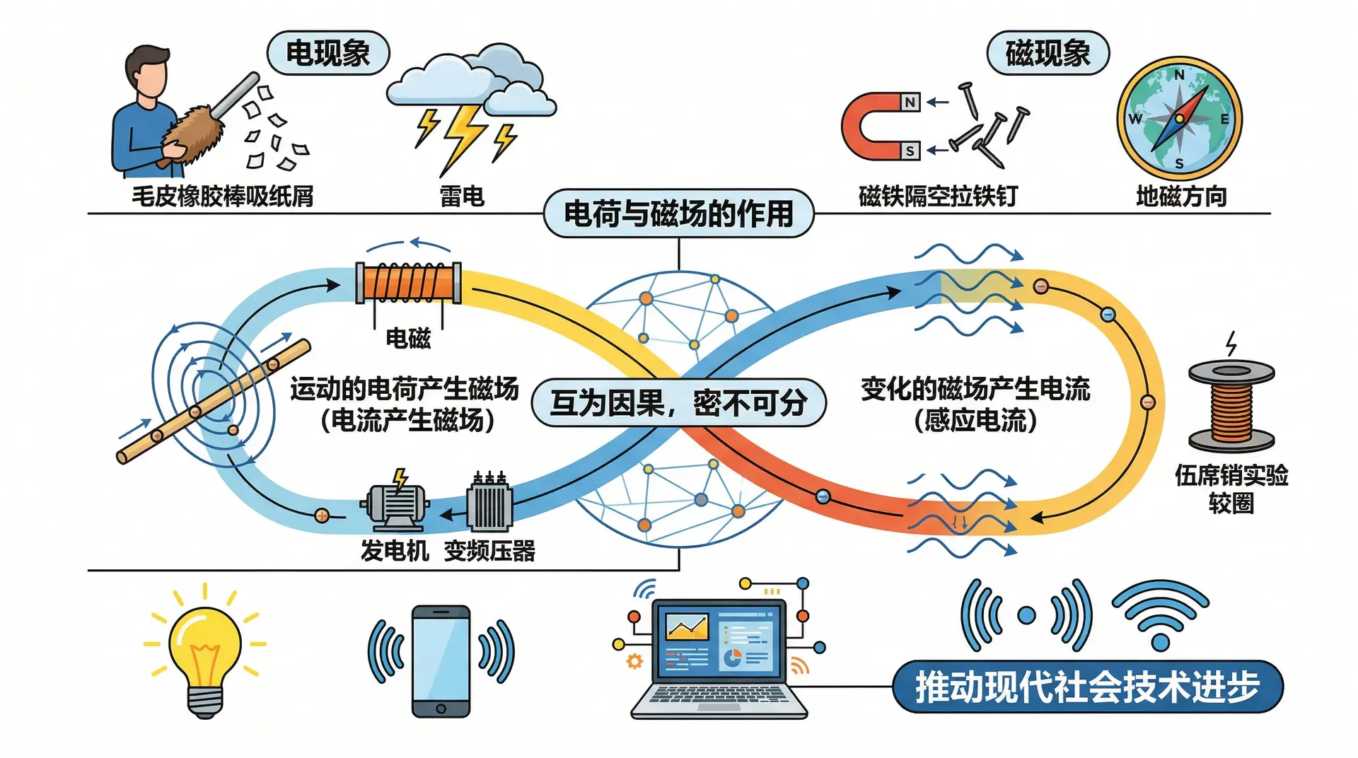 这种“运动的电荷产生磁场,变化的磁场推动电荷运动”的深刻联系,组成了电磁学的核心内容。现今我们所用的电灯、手机、电脑、无线网络等日常设备,无一不依赖于电与磁的相互作用。这一互为因果、密不可分的关系推动了现代社会的技术进步和便利生活,是理解物理世界至关重要的一环。