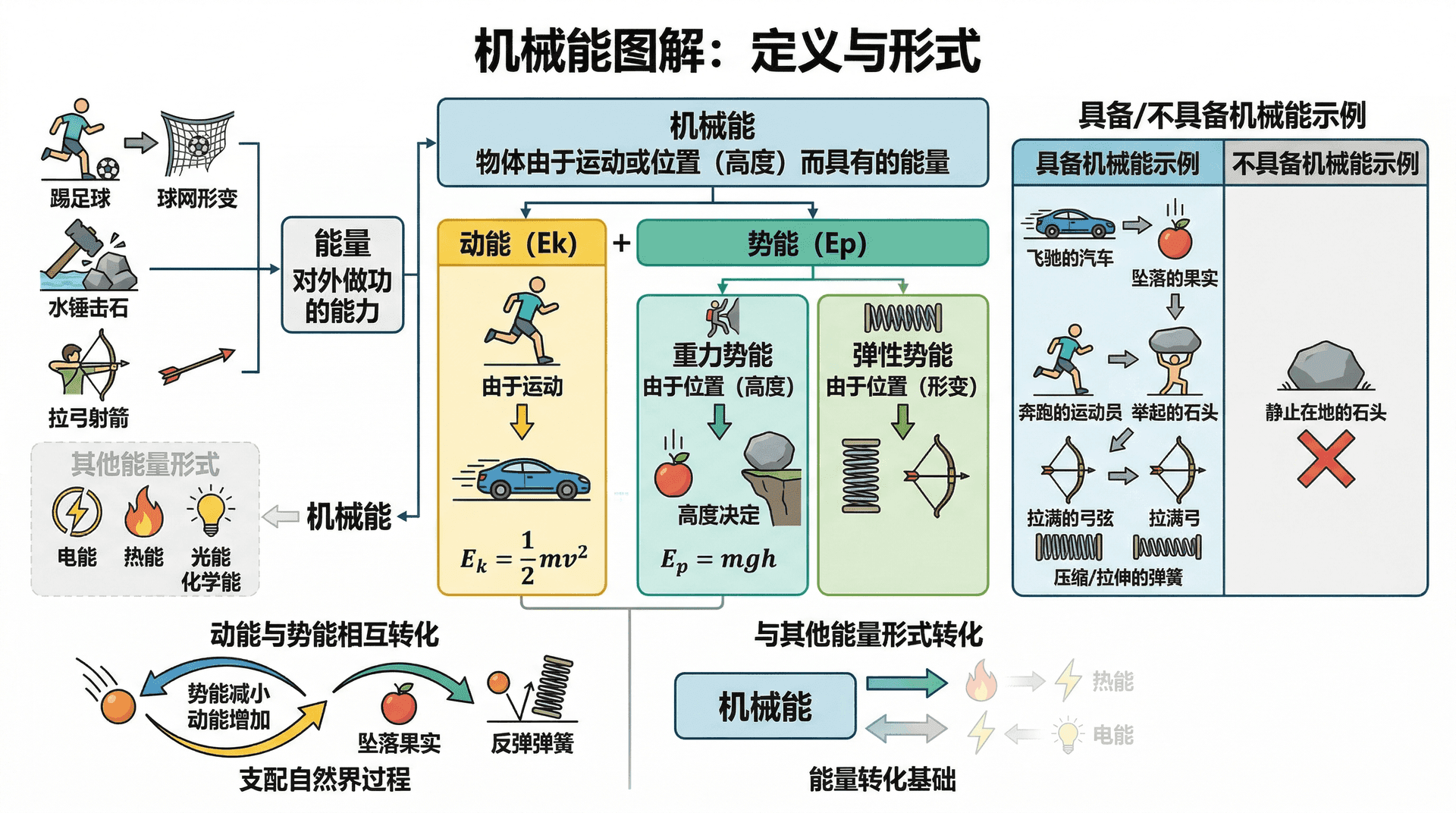 换句话说,只要物体在运动,或者物体处于较高或较低的位置,它就可能具有机械能。例如,静止在地上的石头不具备机械能,但被举到半空后就具有了。奔跑中的运动员、飞驰的汽车、坠落的果实、攀登的登山者、压缩或拉伸的弹簧,都是机械能的具体范例。机械能为日常生活和工程实践提供了巨大的作用基础。它既能转化为其他形式的能量,也可以在动能与势能之间相互转化,支配了自然界和技术世界中大量基本过程。