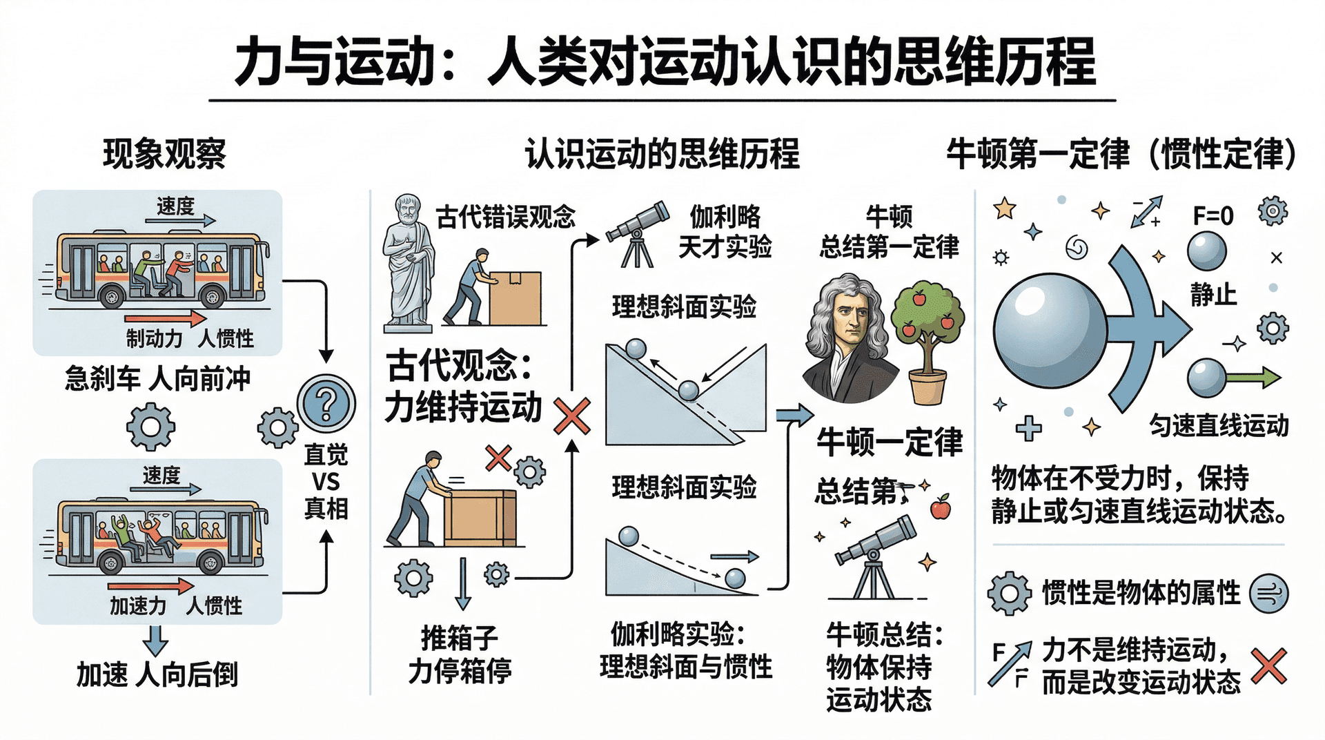 你有没有坐过急刹车的公共汽车?车突然刹停,人会不由自主地向前冲;汽车从静止猛然加速,人又会向后倒。这些现象背后,隐藏着一条贯穿整个力学的基本规律——牛顿第一定律。