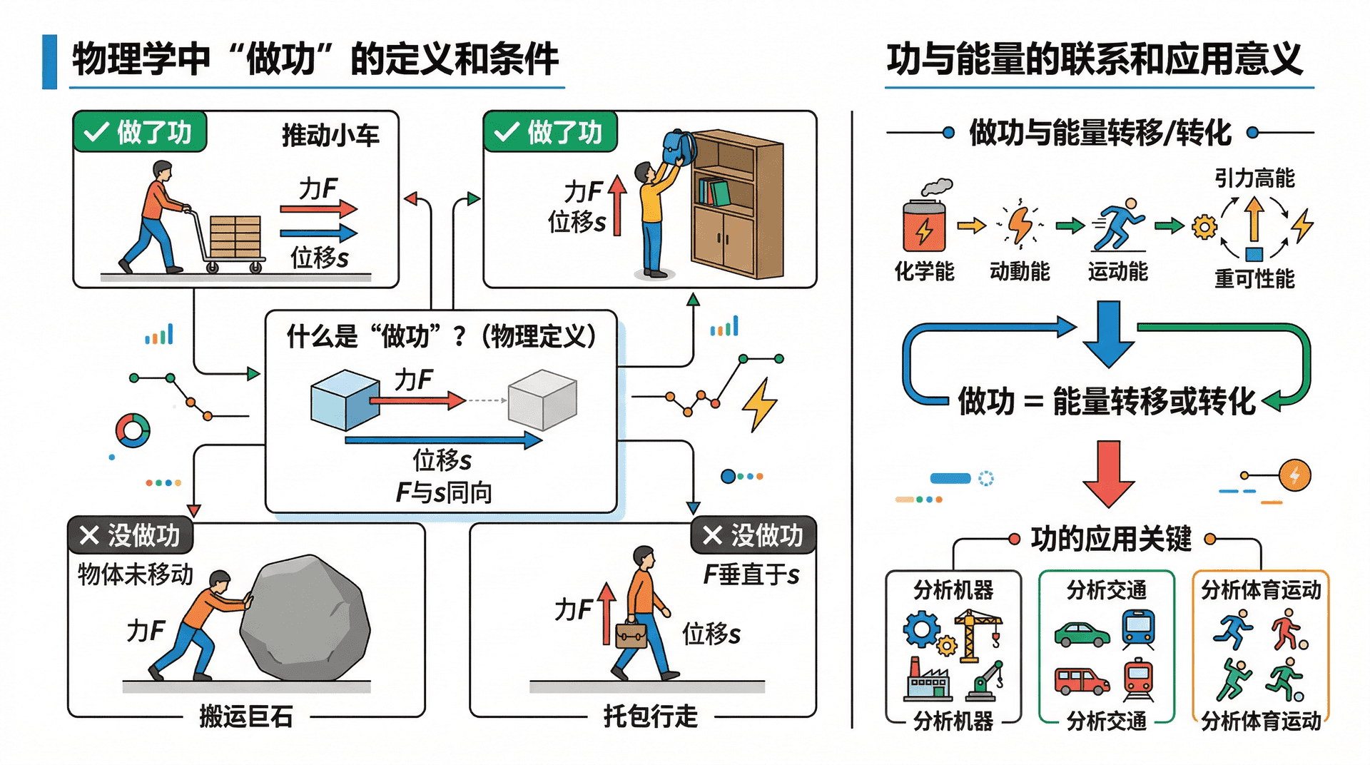 功和能量密切相关。做了功,就意味着能量发生了转移或转化。理解功是理解能量的第一步,也是分析机器、交通、体育运动中许多现象的关键。