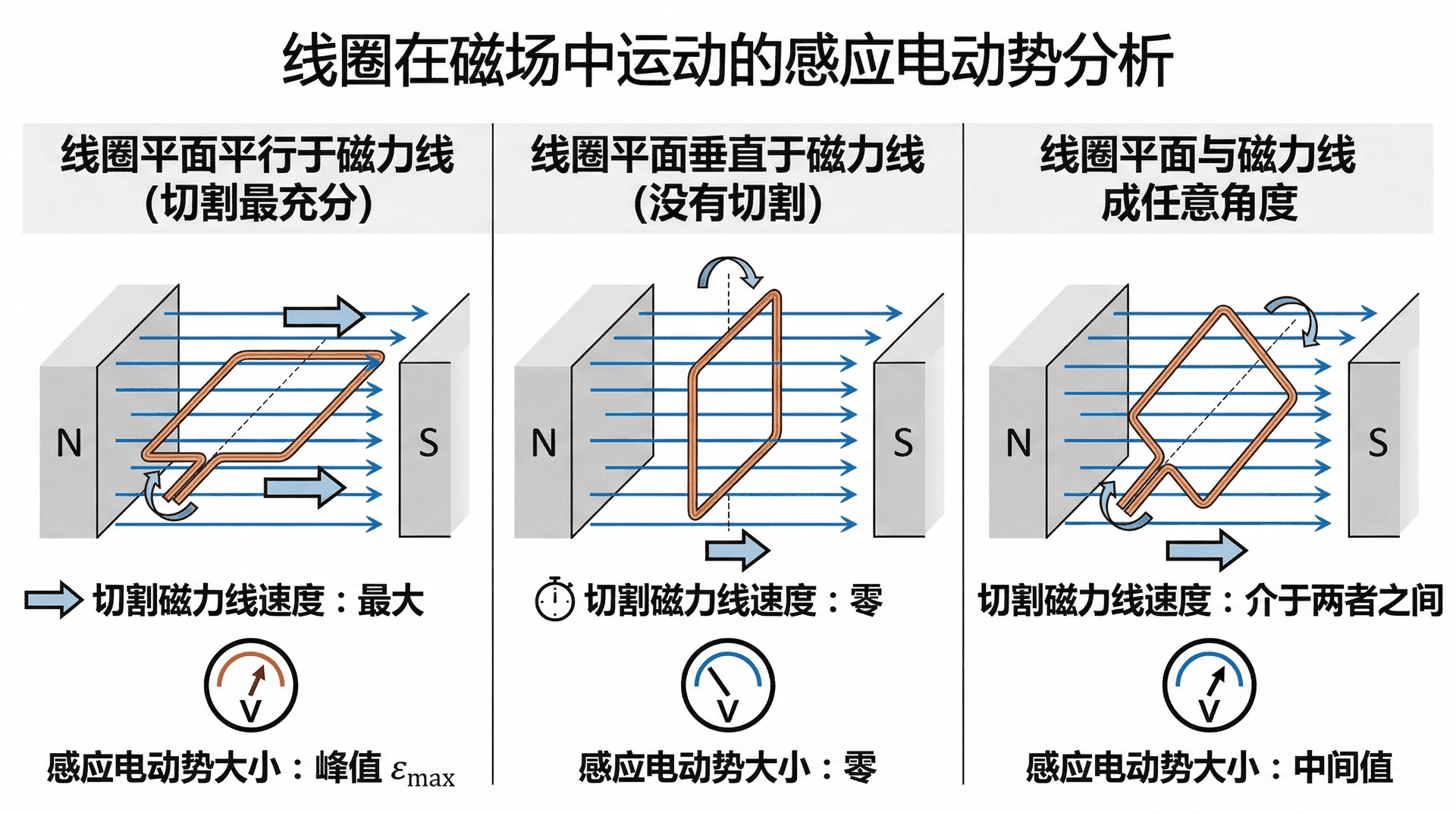 当线圈在磁场中旋转时,线圈不断地切割磁力线,线圈两端就持续产生感应电动势。旋转过程中,线圈平面与磁力线的位置关系不断变化,感应电动势也随之变化: