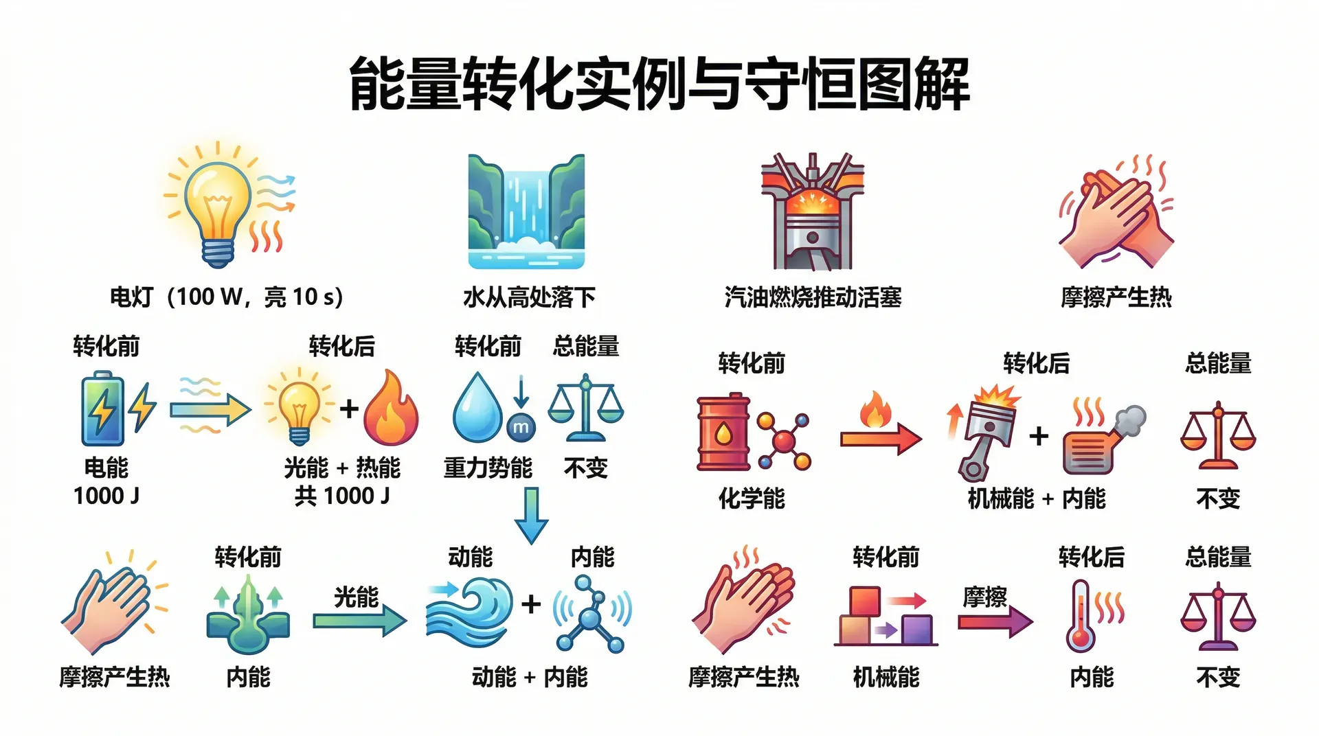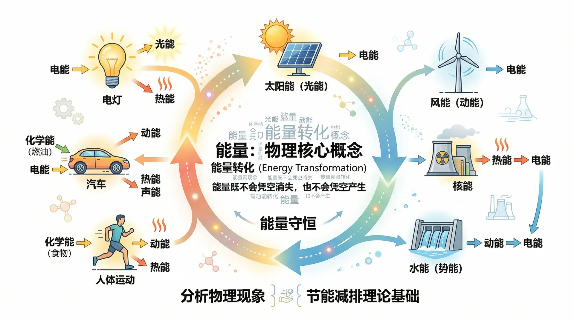 能量是物理学中最核心的概念之一。日常生活中,电灯发光、汽车行驶、人体运动,背后都涉及能量从一种形式转变为另一种形式。能量既不会凭空消失,也不会凭空产生,它只会在不同形式之间相互转化。理解这一规律,不仅有助于分析各种物理现象,也是节能减排的理论基础。
