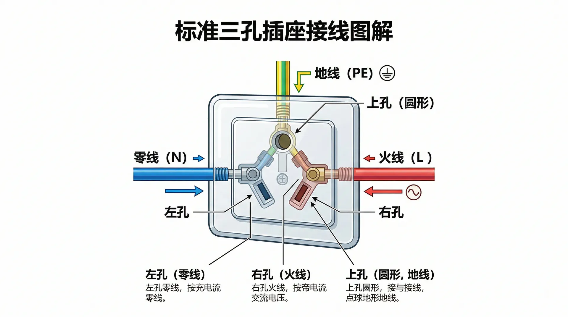 家庭插座的接线位置有固定规范,常见三孔插座的接线如下: