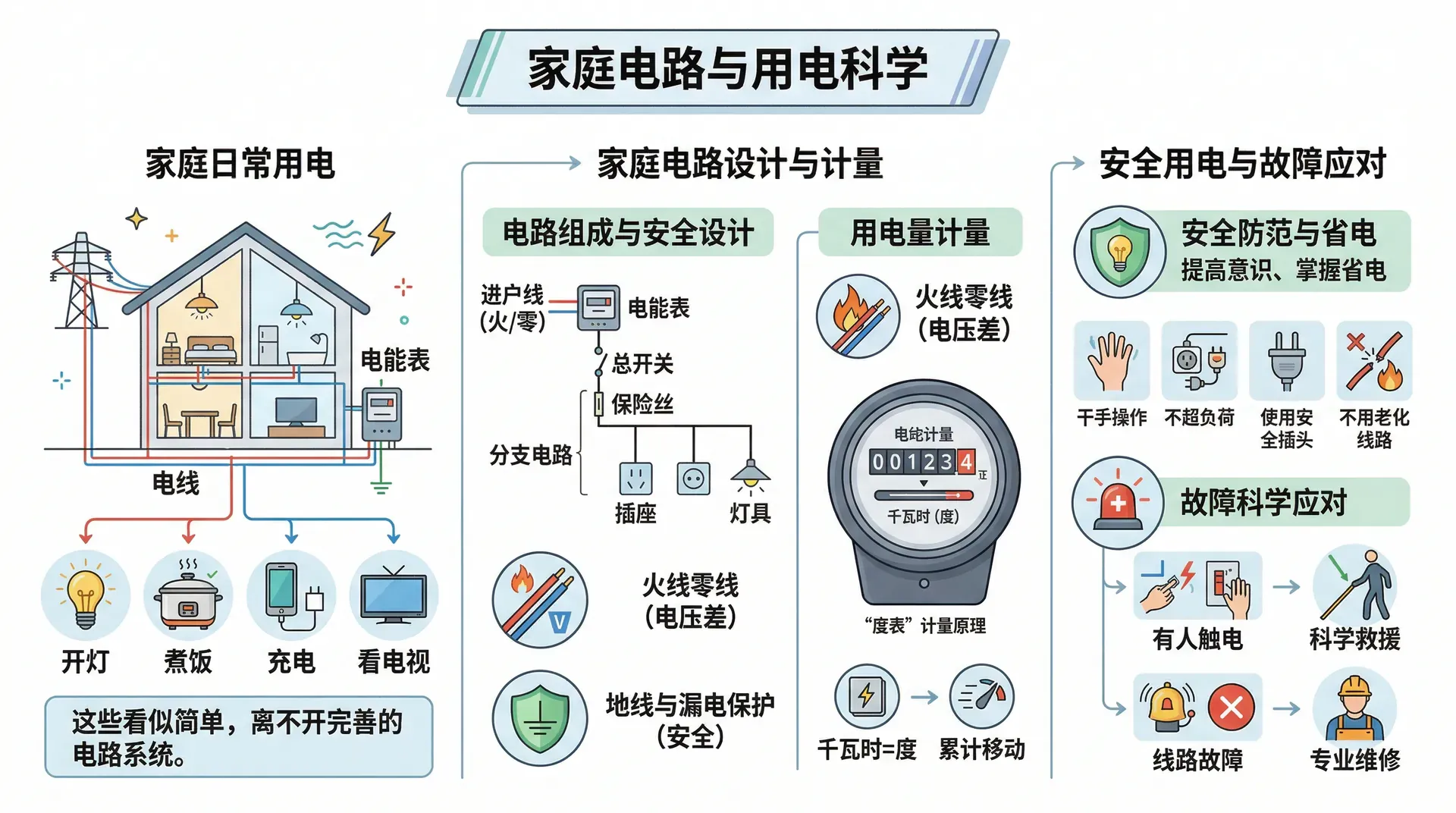 那么,家庭电路究竟是如何设计的?我们家里的插座和灯具为什么用起来如此方便却又相对安全?家用电器每个月消耗了多少电能?这些用电量是如何通过“度表”计量出来的?遇到家用电路故障甚至有人触电时,我们又应该如何科学应对,保障人身安全?这些问题,既包括物理原理,也涉及实用操作,是每个家庭成员都应当掌握的基础知识。