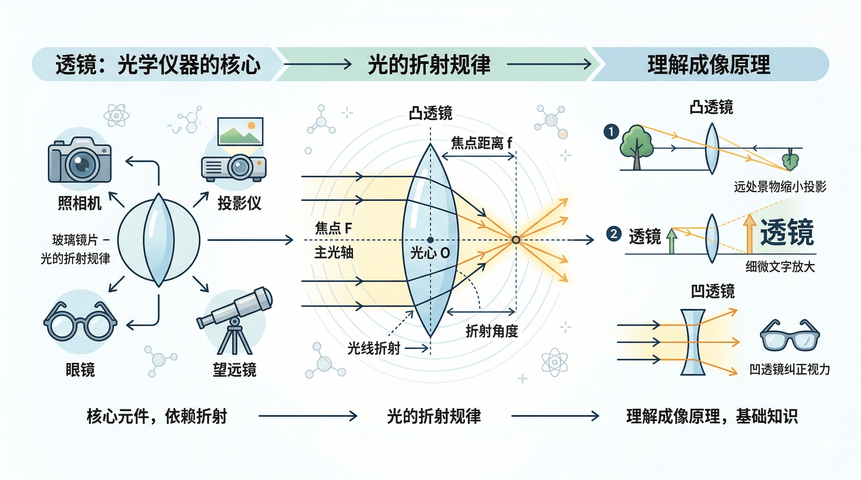 透镜是光学仪器的核心元件,照相机、投影仪、眼镜、望远镜的成像都依赖透镜对光线的折射作用。玻璃镜片看似简单,却能将远处的景物缩小投影,也能将细微的文字放大数倍,背后遵循的正是光的折射规律。理解透镜的成像原理,是学习所有光学仪器的基础。