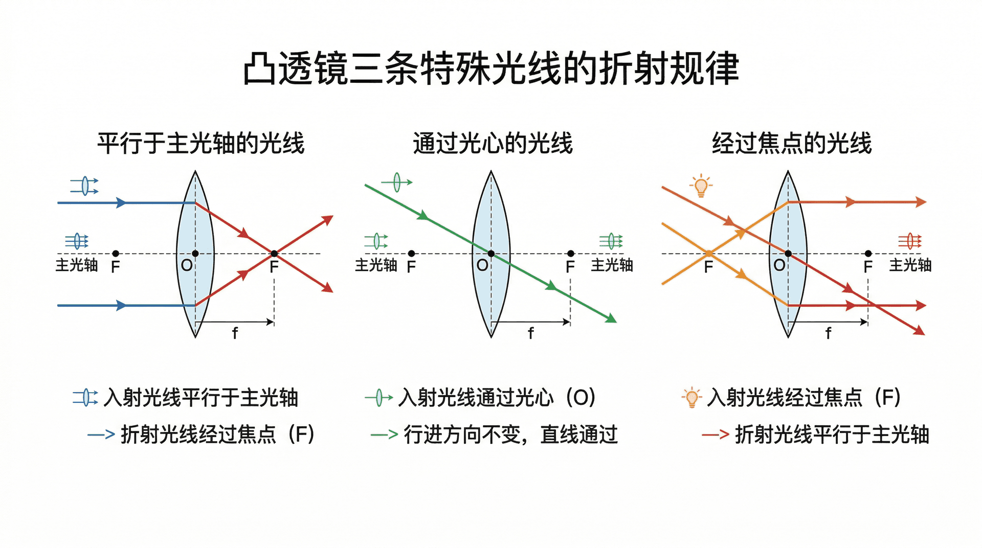 这三条特殊光线是作图求像的标准工具,利用其中任意两条,就能在图中确定像的位置。在凸透镜成像的分析中,这三条光线要牢记。