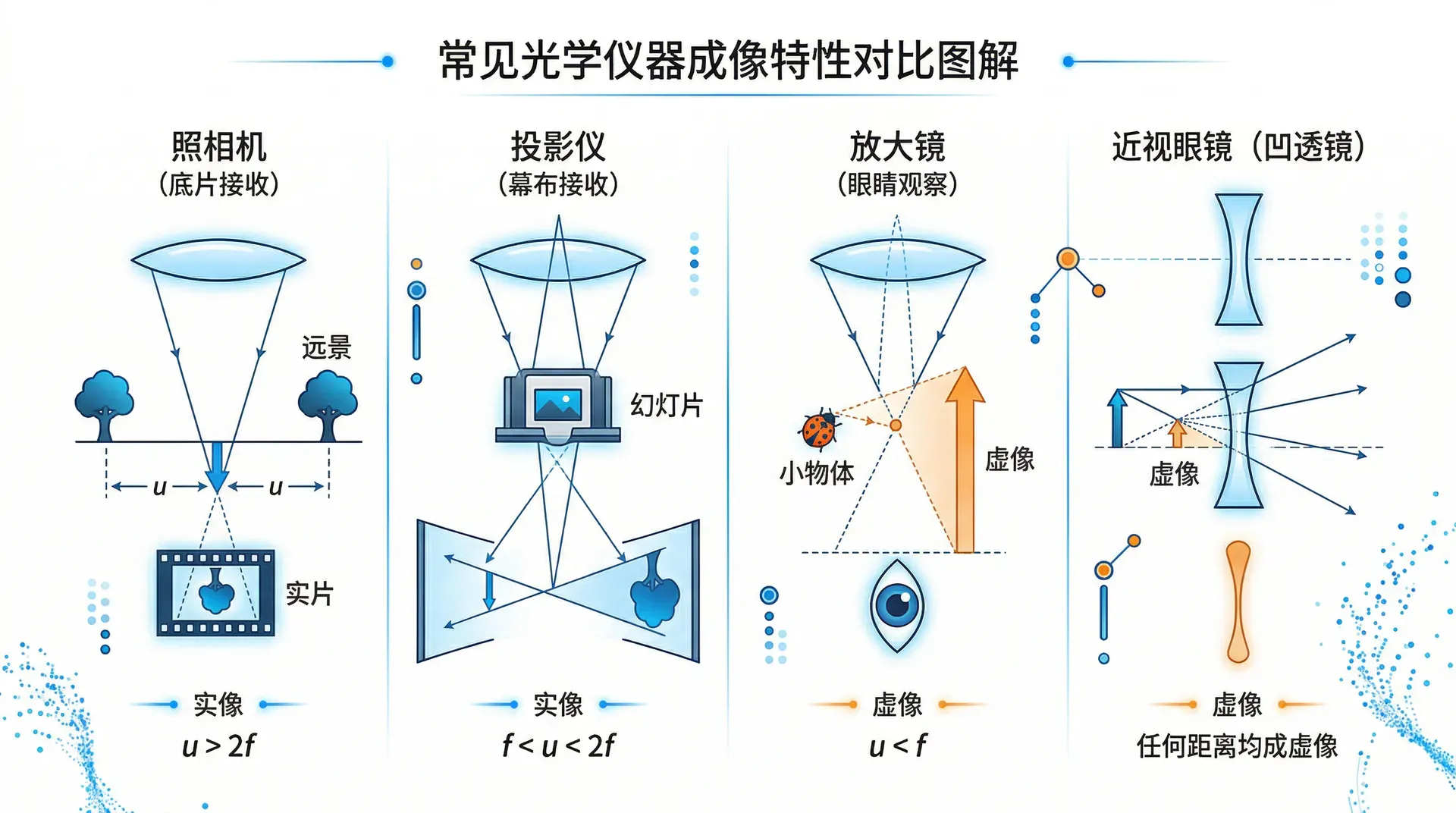 实像和虚像的区别,在光学仪器的设计中非常关键。照相机需要在底片(或感光元件)上形成实像,投影仪需要在幕布上形成实像,因此都要求物距大于焦距。而放大镜只需要人眼观察虚像,不需要光屏,所以物距小于焦距即可工作。