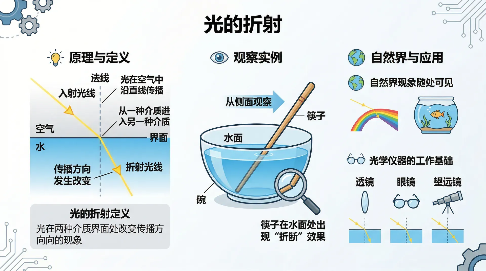 光在空气中沿直线传播,但当它从一种介质进入另一种介质时,传播方向往往会发生改变。把一根筷子插入装水的碗中,从侧面观察,会看到筷子在水面处出现了“折断”的效果。这种光在两种介质界面处改变传播方向的现象,就是光的折射。折射现象在自然界中随处可见,也是透镜、眼镜、望远镜等光学仪器的工作基础。