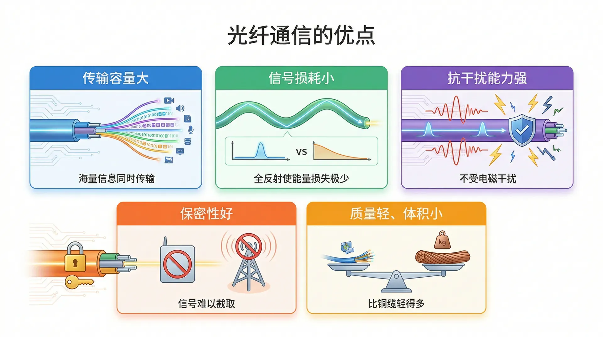 光纤通信正是利用全反射原理,让光信号在极细的玻璃纤维内部不断全反射向前传播,传输距离可达数千千米,信号几乎不衰减。全反射使光被“锁”在纤芯内部,不会泄漏到外部,这是现代互联网基础设施的核心技术之一。