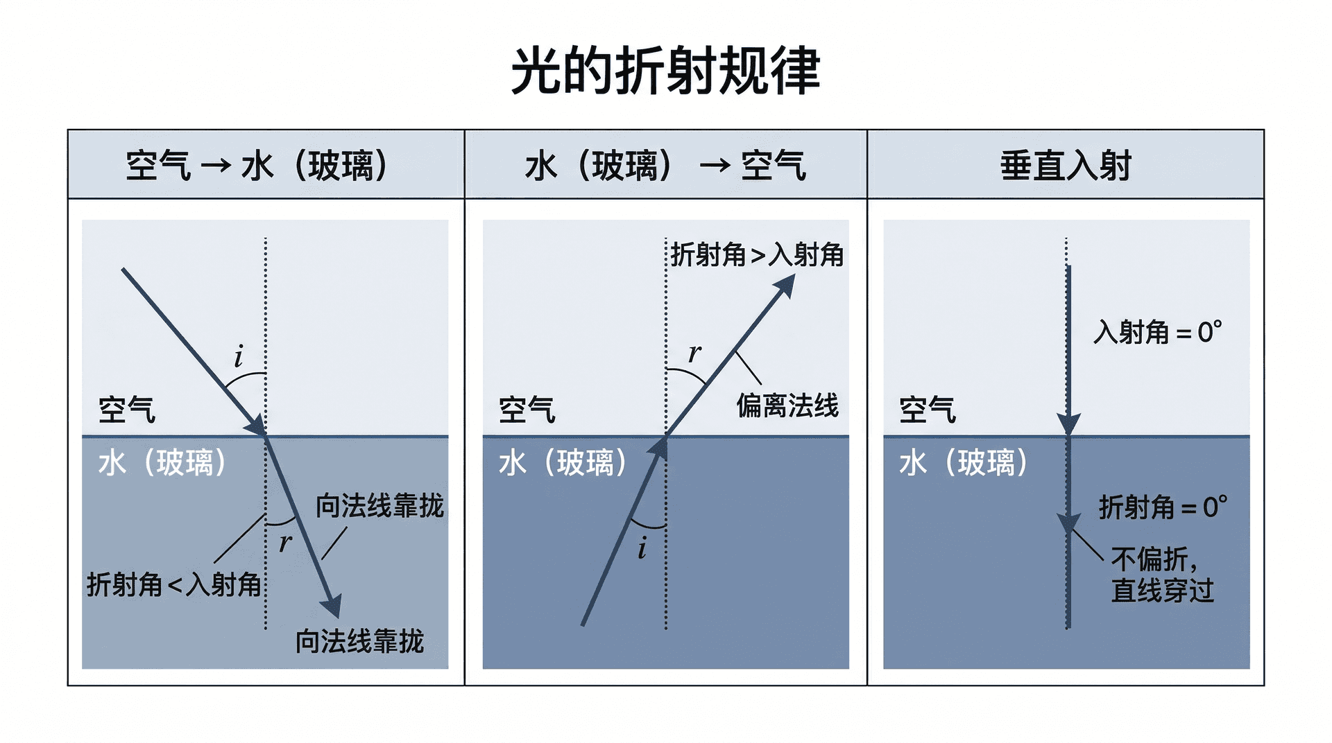 无论入射角如何变化,光从空气进入水或玻璃时,折射角始终小于入射角;光从水或玻璃进入空气时,折射角始终大于入射角。牢记这两个方向,是判断折射问题的基本出发点。