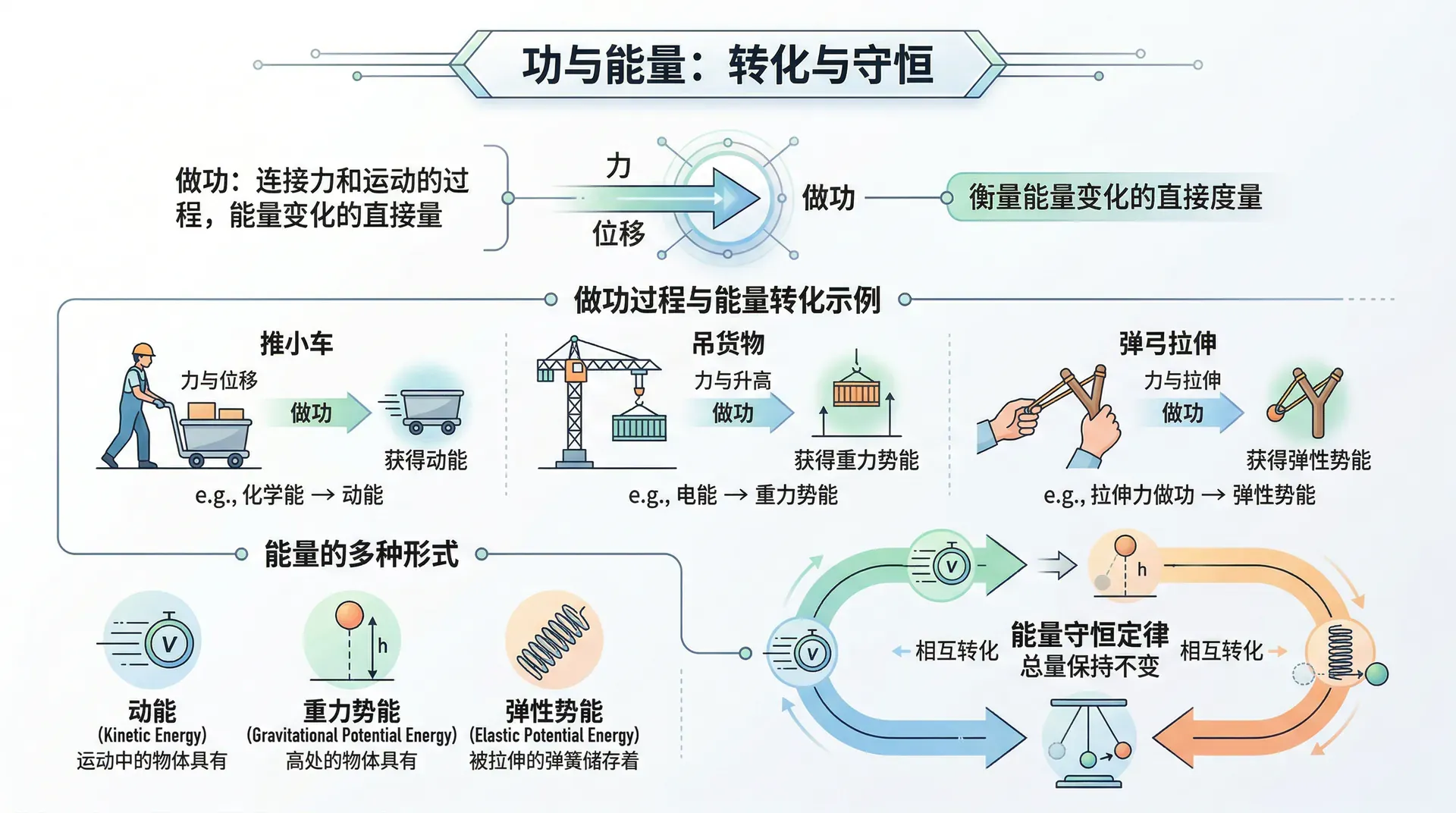功是力学中联系力与运动的核心概念,也是衡量能量变化的直接度量。工人推动小车前进、起重机吊起货物、弹弓弹出石子,这些过程中都有力在做功,能量也随之发生转化。