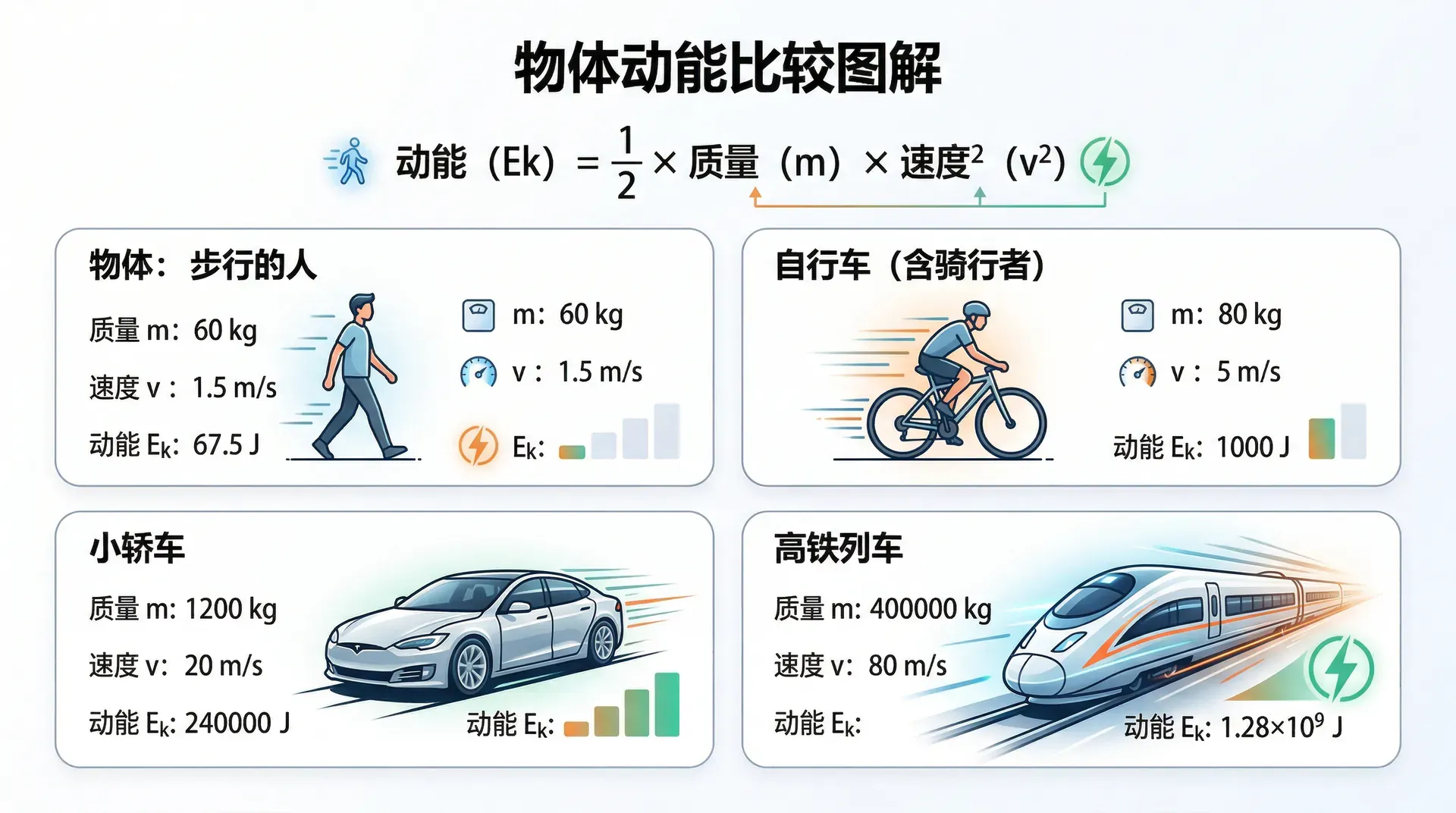 动能的单位与功相同,也是焦耳(J)。从公式可以看出,动能与质量成正比,与速度的平方成正比——速度增大一倍,动能增大四倍。