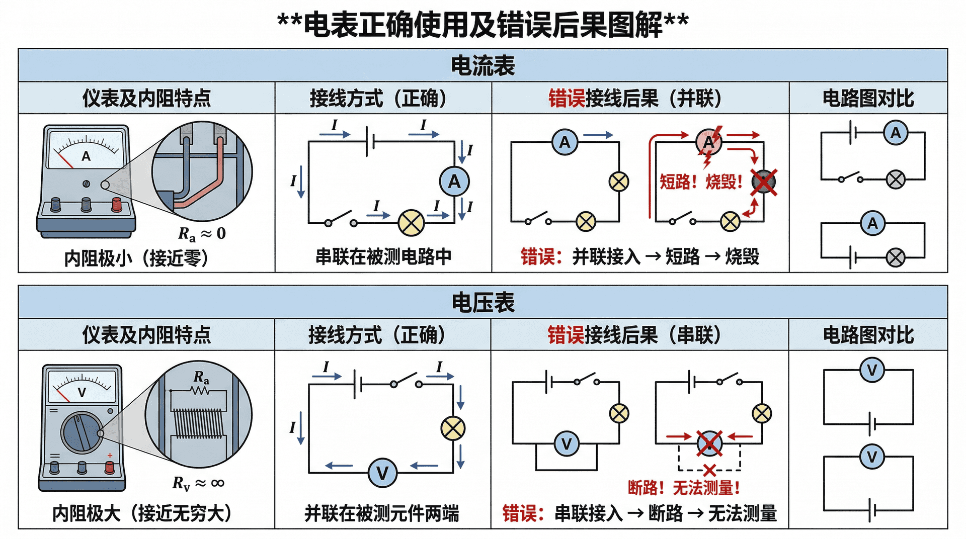 电流表的内阻极小,相当于一段导线,使用时必须串联在被测电路中,让被测电流完整地流过电流表。若将电流表并联在电路中,几乎相当于将被测部分短路,电流表会因电流过大而烧毁。