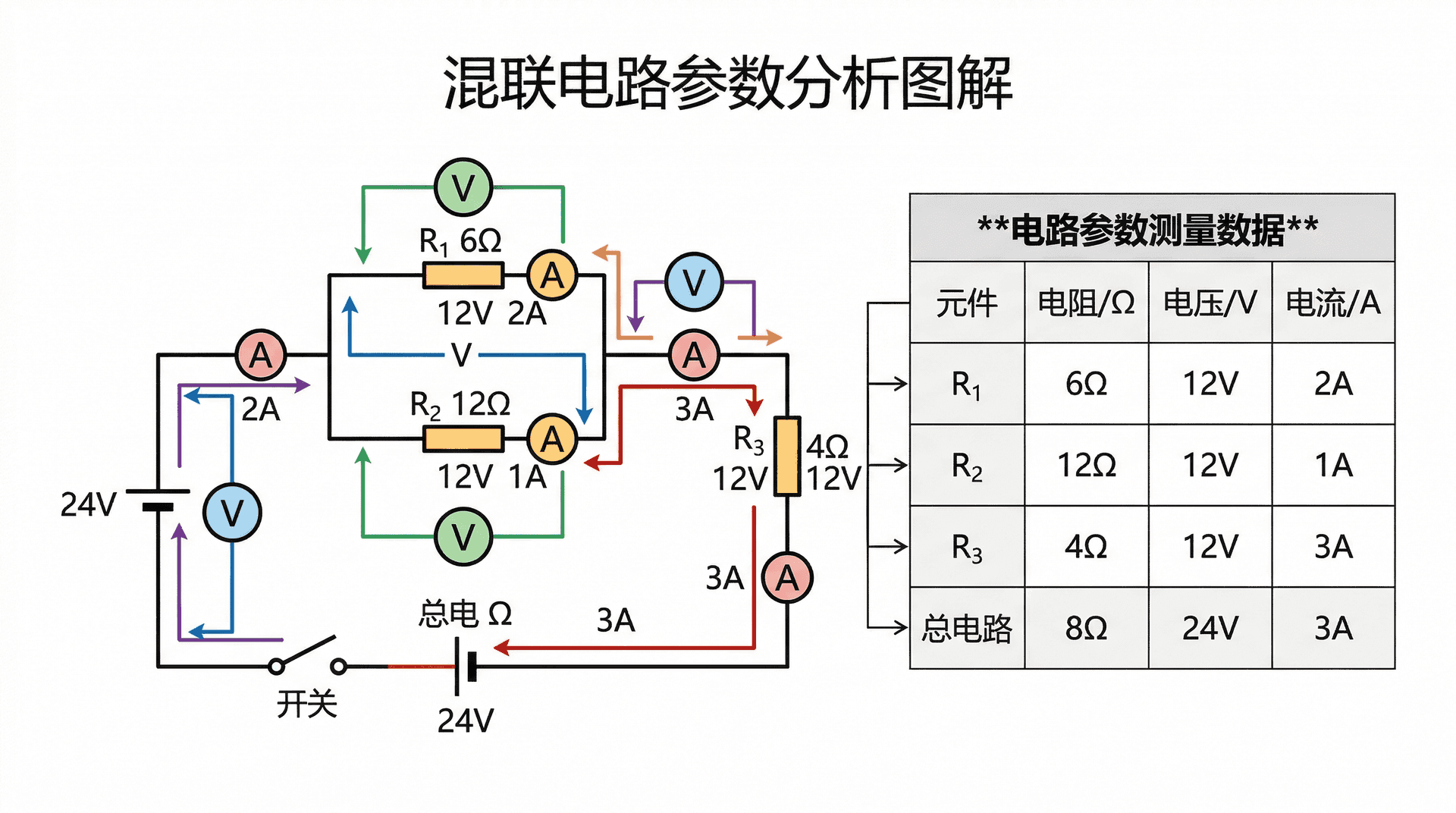 在实际电路中,串联和并联往往同时存在,形成混联电路。分析混联电路的关键在于正确判断各电阻之间的连接关系,将复杂电路逐步化简为单一的等效电阻。