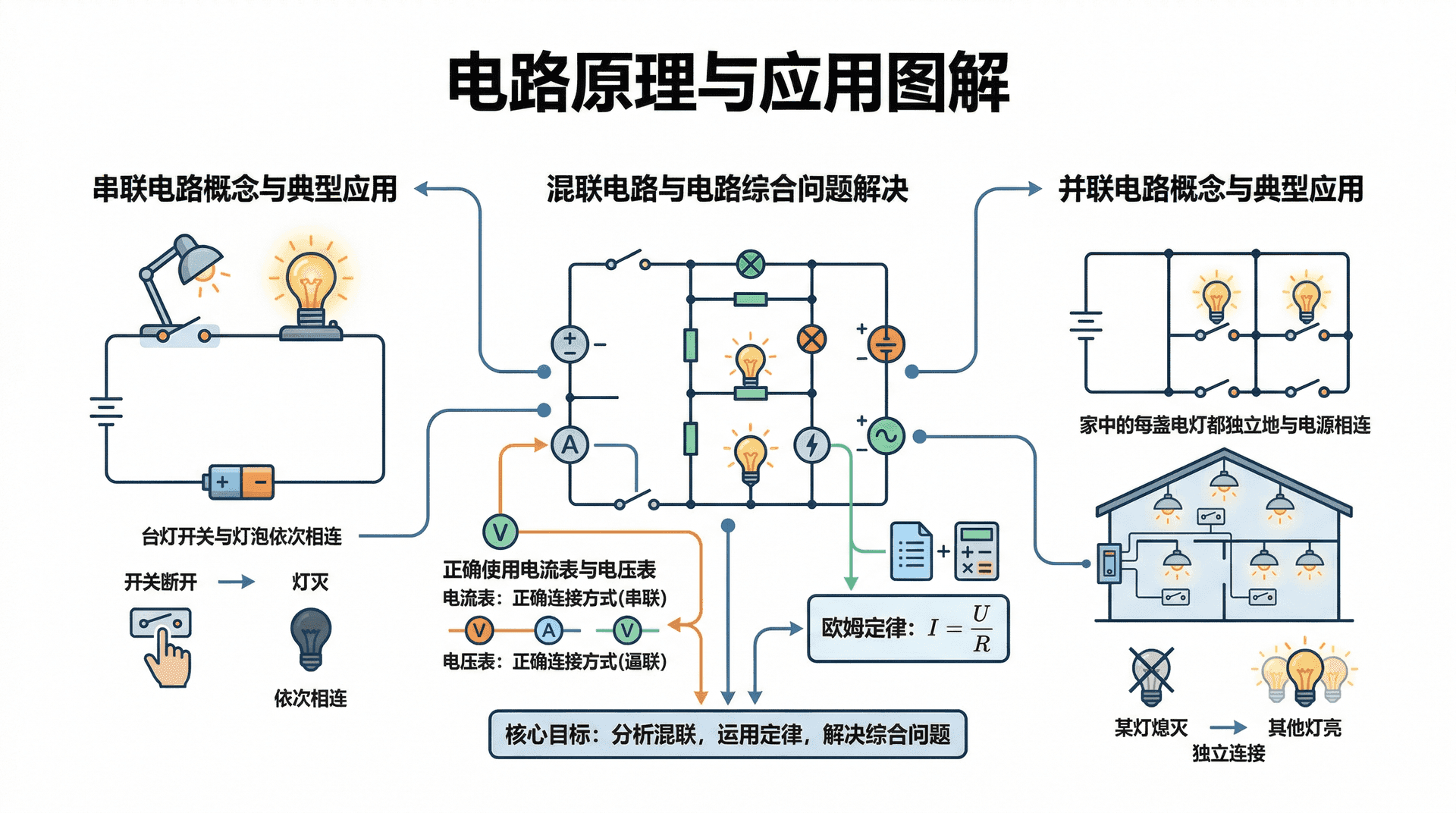 电路是电流流通的闭合路径,根据元件连接方式的不同,可以分为串联和并联两种基本形式。在实际应用中,家中的每盏电灯都独立地与电源相连,某盏灯熄灭不影响其他灯继续发光——这是并联的典型体现;而台灯的开关与灯泡依次相连,开关断开则灯灭——这是串联的典型体现。在更复杂的电路中,串联和并联往往同时存在,形成混联电路。学会分析混联电路,正确使用电流表与电压表,并运用欧姆定律解决综合电路问题,是电路学习的核心目标。