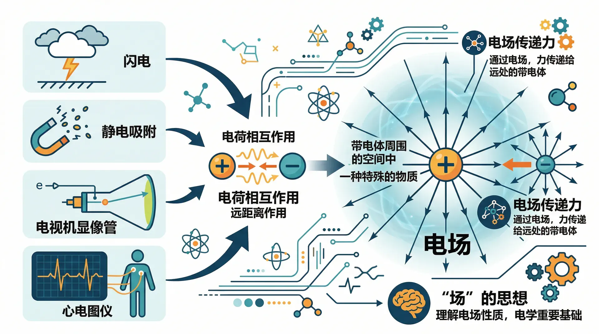 物理学用“场”的思想来解释这一现象:带电体周围的空间中存在一种特殊的物质——电场,正是这个电场把力传递给了远处的其他带电体。理解电场的性质、掌握电场中能量的描述方式,是学习电学的重要基础。