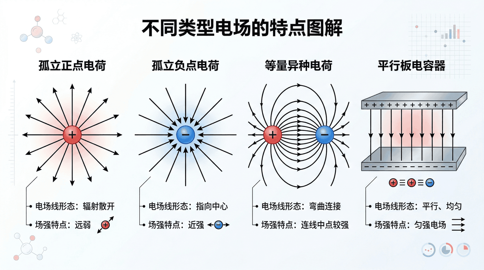 电场线有几条核心规律,掌握这些规律可以帮助判断各种电场的分布情况: