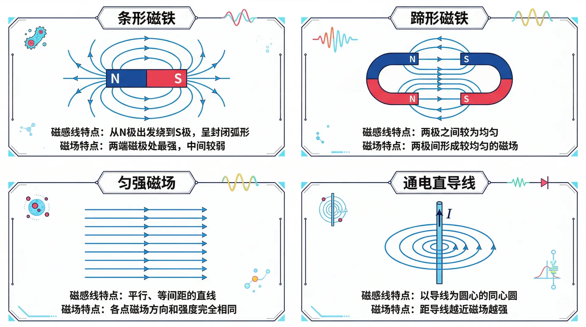 磁感线上每一点的切线方向,就是该点的磁场方向(也是N极受力方向)。磁感线的疏密程度反映磁场的强弱:磁感线越密的地方,磁场越强。
