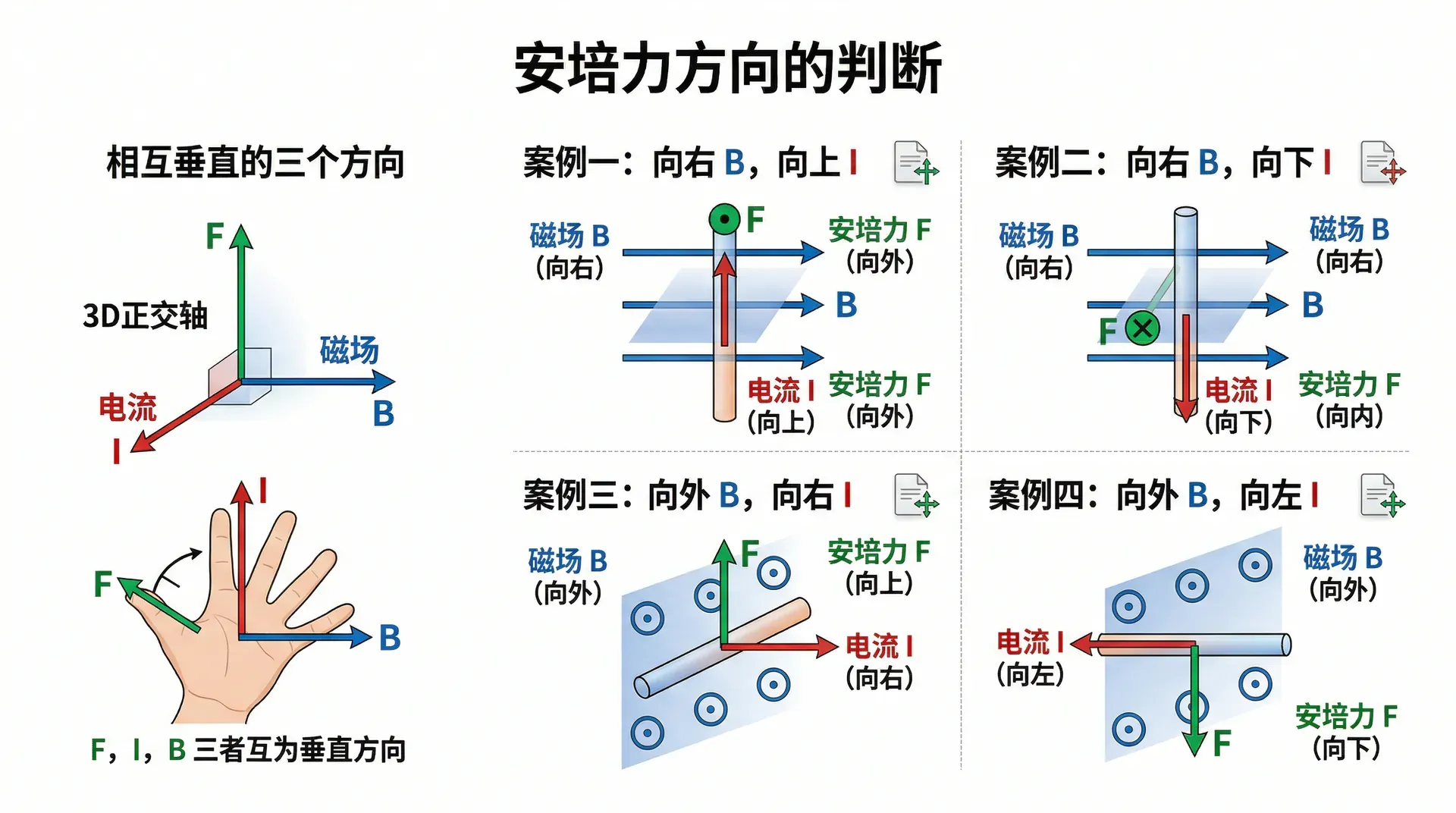 左手定则的关键记忆方法:磁感线穿手心(四指对准磁场),四指顺电流,大拇指指安培力方向。三个方向——磁场、电流、安培力——两两垂直。只要知道其中两个方向,就能用左手定则确定第三个。