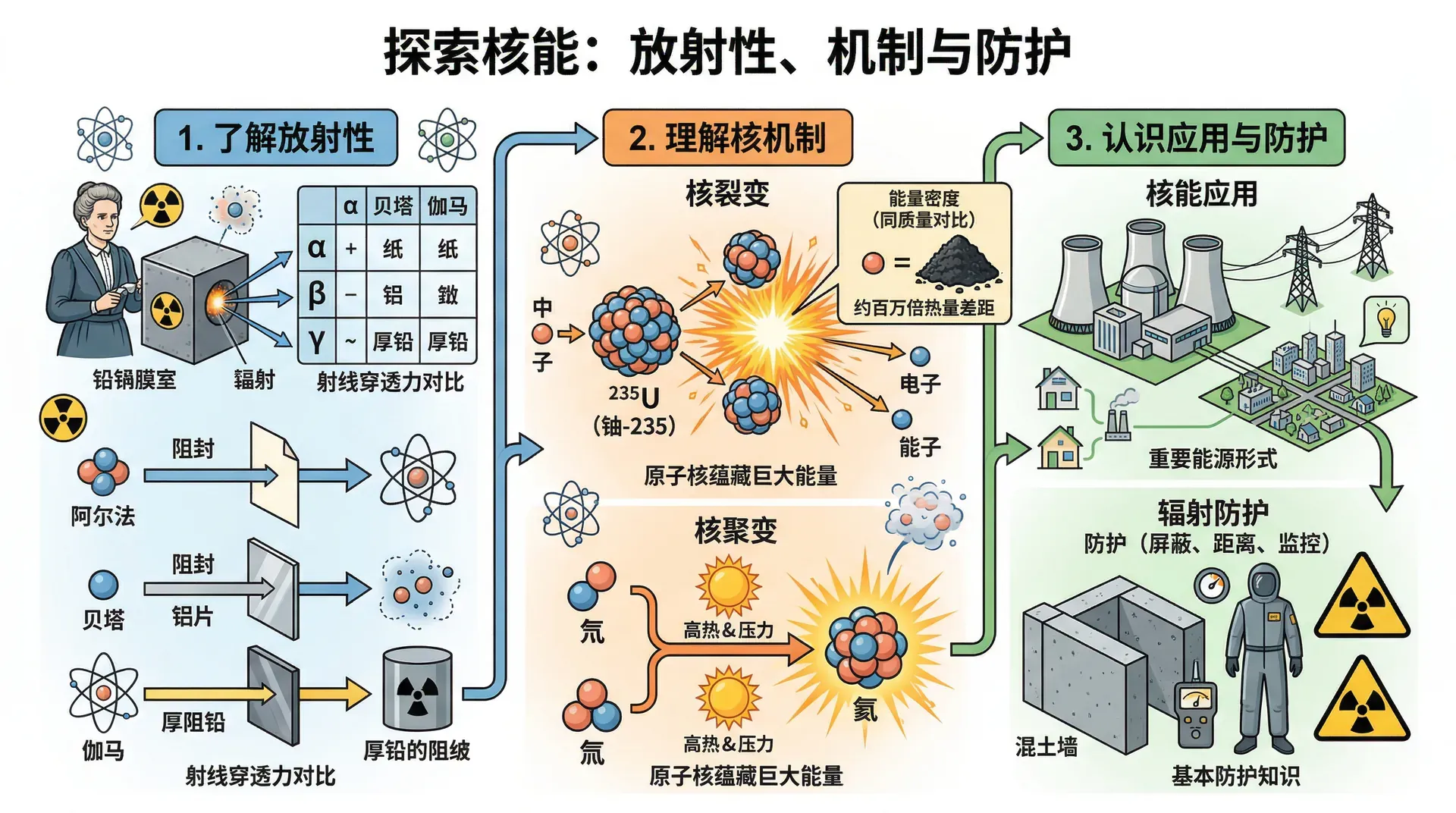 认识核能,需要先了解放射性现象和放射线的特性,再理解核裂变与核聚变的物理机制,最终认识核能的应用与辐射防护的基本知识。