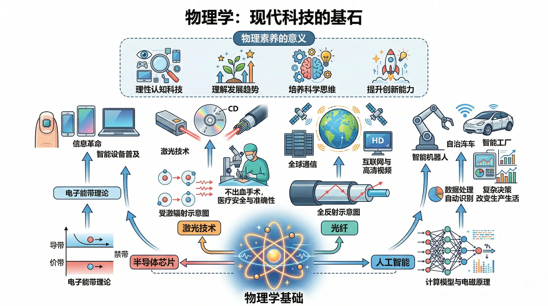 所有这些令人惊叹的现代科技,并非凭空出现,它们背后都蕴藏着深刻的物理原理,如半导体中的电子能带理论、激光的受激辐射机制、光纤中的全反射现象,以及人工智能所用的计算模型、电磁原理等。正是物理学对微观世界的探索和对能量、信息传递规律的揭示,才为这些技术的实现提供了基础。
